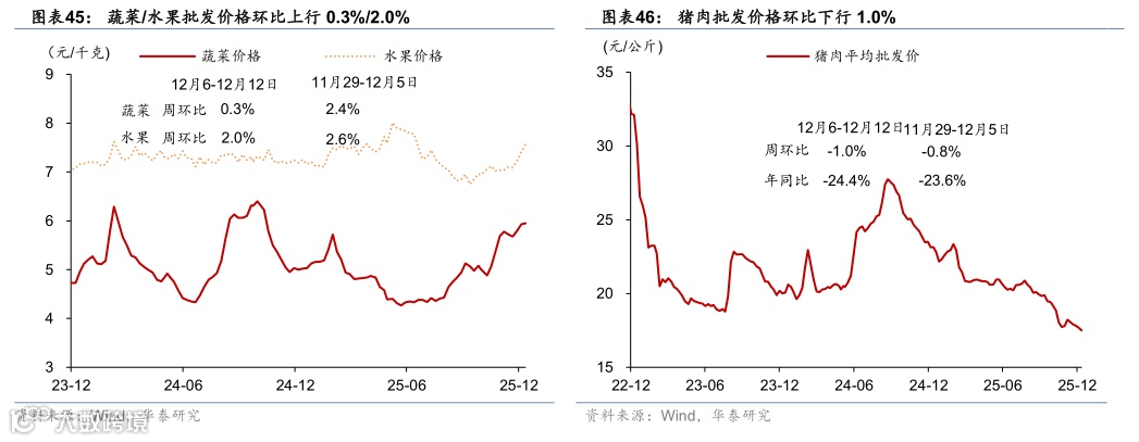 消费活动:12月1-7日乘用车零售同比减少,电影票房同比增加。12月1-7日乘用车销量同比回落32.3%,环比回落66.2%。今年以来累计零售2178.1万辆,同比增长5%。12月6-12日,全国电影票房同比大幅上行179.9%,环比回落10.0%,电影票房总体表现有所回暖。