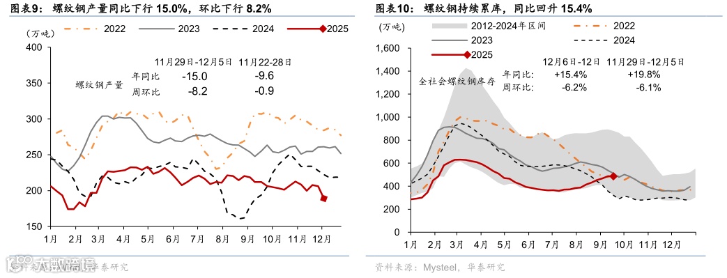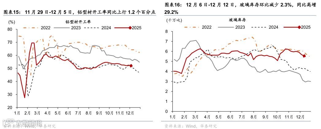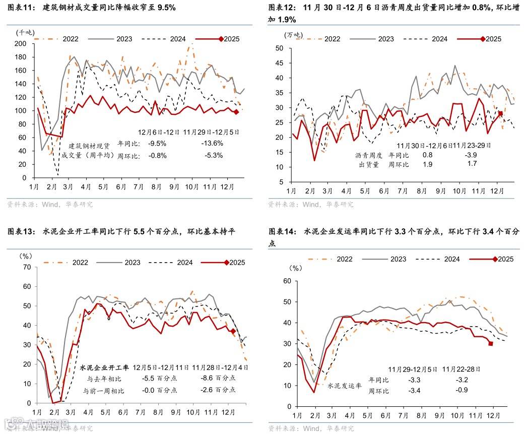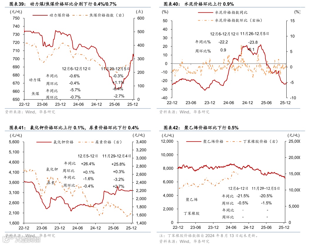 下游:国内建筑开工需求局部改善但整体仍承压,水泥开工率同比下行,而建筑钢材成交量同比降幅略收窄。12月5-11日,水泥企业开工率同比下行5.5个百分点,环比较前一周基本持平。12月6-12日,建筑钢材周均成交量同比降幅由前一周的13.6%收窄至9.5%,环比回落0.8%。此外,12月5-11日,半钢胎企业开工率同比降幅由前一周的8.1个百分点收窄至7.5个百分点,环比较前一周上升0.6个百分点;12月6日-12月12日,螺纹钢库存同比高增15.4%,环比回落6.2%,螺纹钢库存去化压力仍偏大。