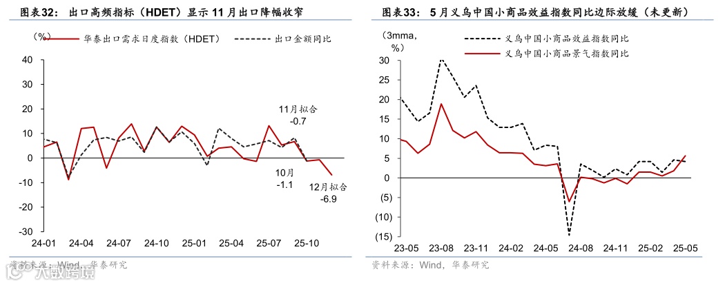 上周居民出行活动景气度仍在高位,而乘用车零售同比转负,工业生产逐步走入淡季,建筑活动及地产成交同比仍偏低。出行及消费方面,上周18城地铁客运量同比上行4.1%,国内航班数同比亦上行2.1%;乘用车销量同比回落32.3%。工业生产趋于平淡,焦化/高炉开工率同比分别下行0.6/2.8个百分点,半钢胎开工率同比回落7.5个百分点;建筑开工需求亦整体偏弱,其中建筑钢材成交量同比回落0.8%,水泥开工率亦同比下行5.5个百分点。出口及物流方面,HDET 高频指标显示12月出口同比有所放缓,CCFI同比下行23.9%,CDFI同比回升32.0%。地产方面,上周44城新房/22城二手房成交面积同比降幅由前一周的49.1%/41.0%收窄至41.9%/34.6%。