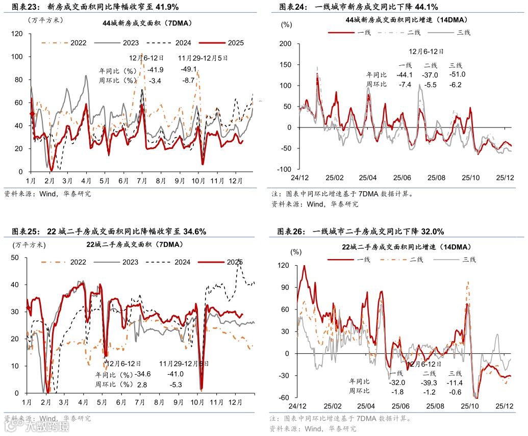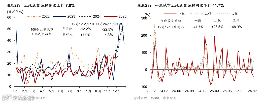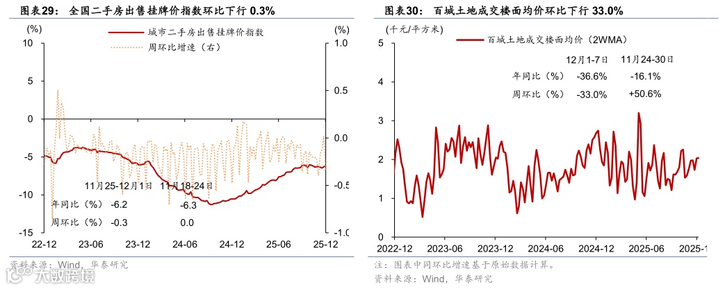地产需求:上周新房成交面积同比降幅由前一周的49.1%收窄至41.9%,二手房成交面积同比降幅亦由前一周的41.0%收窄至34.6%。其中,一线城市新房成交面积同比降幅从前一周的34.0%走阔至44.1%,而一线二手房成交面积同比降幅从前一周的34.1%收窄至32.0%。价格方面,12月1日-12月7日,百城土地成交楼面均价环比下行33.0%。
