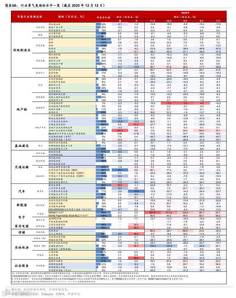 绝对水平:有色金属、社会服务和煤炭等行业景气度相对较高;国际有色金属价格仍在上行通道中,而反内卷市场化推进下水泥价格环比有所回升,螺纹钢和玻璃价格回落、可能显示地产开工需求仍偏弱,半导体产业链价格仍在高位;从各行业供给、需求/价格所在历史序列的百分位值来看(2013年至今,下同):