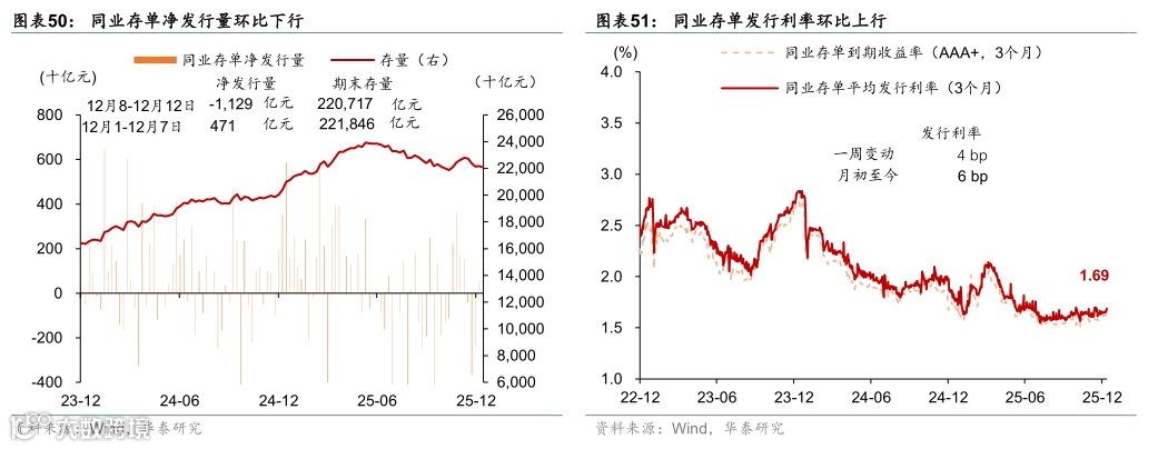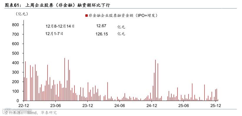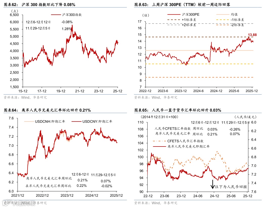 融资及汇率:沪深300指数环比回落,房地产债发行金额环比上升,股权融资额环比下行,人民币兑美元汇率升值,对一篮子货币汇率环比回升。指数表现方面,沪深300指数周环比下降0.08%,PE(TTM)估值水平亦较前一周边际回落。汇率方面,截至12月12日,人民币兑美元汇率较前一周升值0.22%,对一篮子货币汇率环比回升0.03%。上周利率债总发行1.3万亿元,其中国债发行同比增加8,121亿元,地方政府债发行量同比减少3,517亿元,政策性银行债同比增加450亿元,利率债净发行量总额同比增加63.9%。