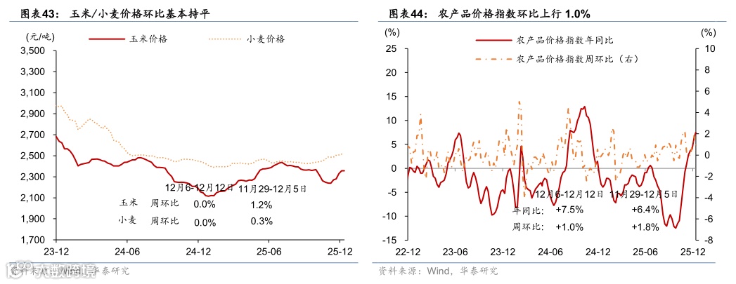农林牧渔:猪肉价格环比回落,生猪养殖利润边际下行。1)猪肉价格上周环比回落1%,主要受供给过剩而需求偏弱拖累,生猪养殖利润上周环比回落2.6。2)12月至今白条鸡均价环比上行0.1%,鸡蛋月均价格环比回升1.3%。