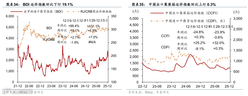 外贸需求:出口高频指标显示12月出口同比较11月有所回落。出口高频指标(HDET)显示12月至今出口同比录得-6.9%。BDI 指数较前一周环比下行19.1%,中国进口干散货运价指数(CDFI)较前一周环比下行9.1%,中国出口集装箱运价指数(CCFI)环比上行0.3%。