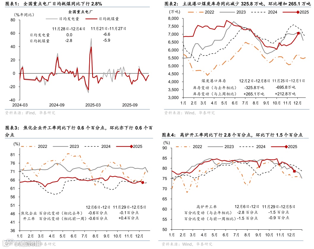 上游:11月28日-12月4日,全国重点电厂日均耗煤量同比降幅边际收窄;12月2-8日,主流港口煤炭库存同比偏低;工业生产逐渐步入淡季,焦化开工率、高炉开工率均低于去年同期。11月28日-12月4日,全国重点电厂日均耗煤量同比降幅亦较前一周的5.9%收窄至2.8%。12月2日-12月8日,主流港口煤炭库存环比增加265.1万吨,同比减少325.8万吨。12月6日-12月12日,焦化企业开工率同比下行0.6个百分点,较前一周环比下行0.6个百分点;高炉开工率同比下行2.8个百分点,环比下行1.5个百分点。