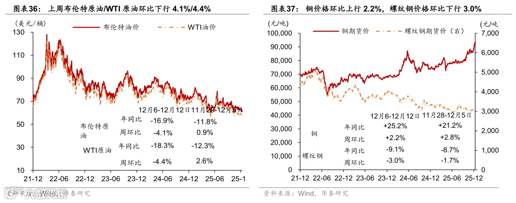 上游:上周国际油价大幅回落,金价上行。截至12月12日,布伦特原油价格周环比下行4.1%至61.1美元/桶,COMEX黄金价格环比上行2.4%至4329.8美元/盎司,可能主要受到美联储降息和地缘政治风险上升的影响。