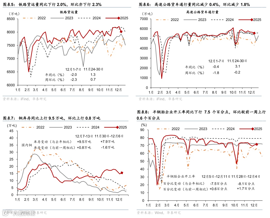 中游:铜库存高于去年同期,环比亦在累库;铁路、高速公路货运量同环比均有所回落。12月7-13日,铜库存高于去年同期9.5万吨,环比上行0.8万吨。12月1日-7日,铁路货运量同比下行2.0%,环比下行2.3%,高速公路货车通行量同比下行0.4%,环比下行1.8%,主要受天气因素扰动。