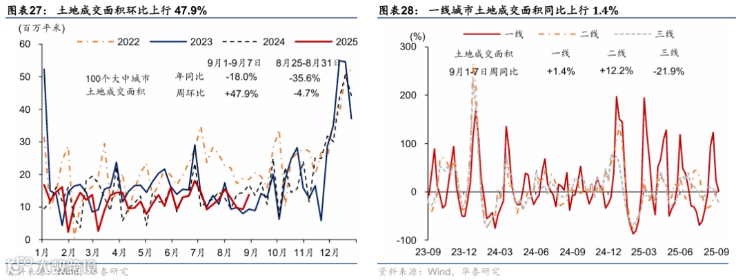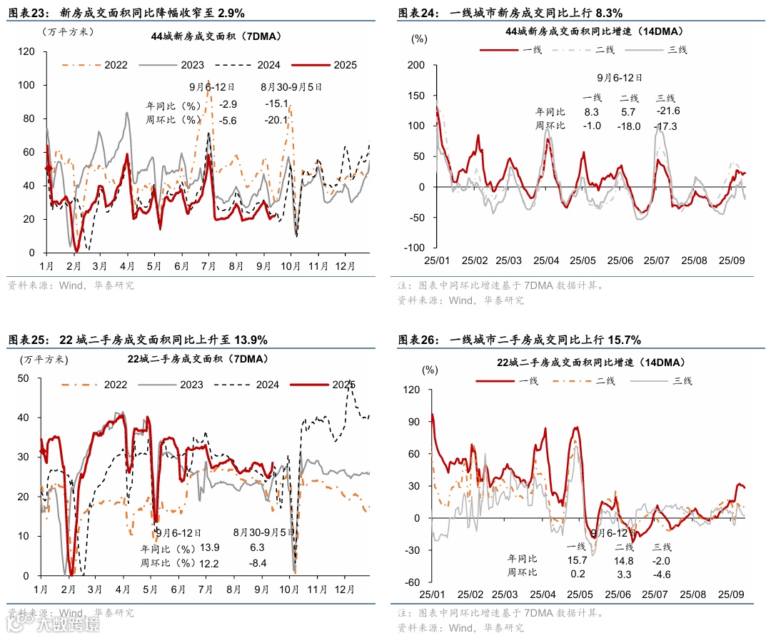 地产需求:上周新房成交面积同比降幅从前一周的15.1%收窄至2.9%,二手房成交面积同比由前一周的6.3%增加至13.9%,其中一线城市新房成交面积降幅从前一周的6.6%走阔至8.3%,而二手房成交面积同比从前一周的6.6%加速到15.7%。价格方面,9月1日-9月7日,百城土地成交楼面均价环比上行34.2%。