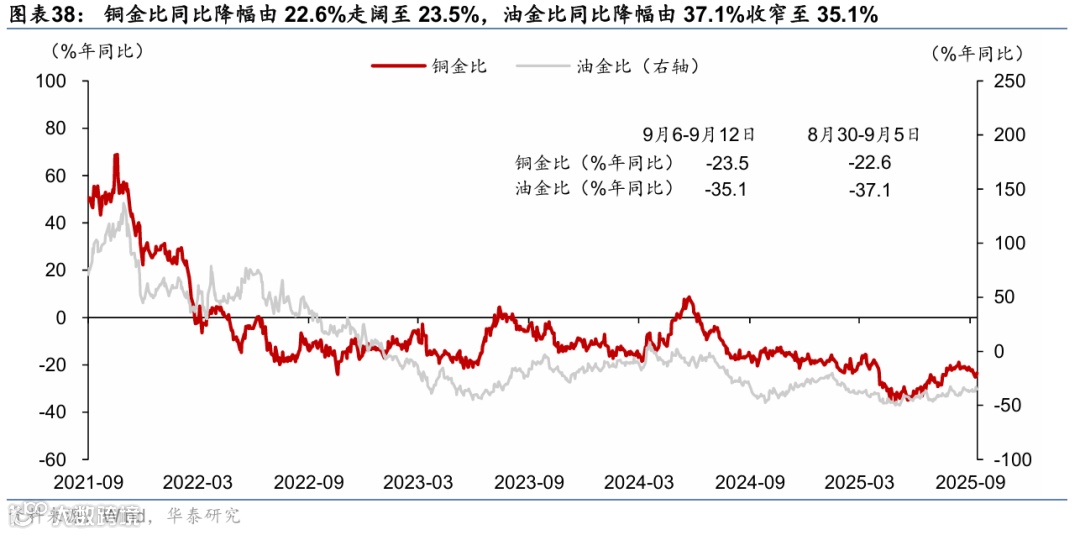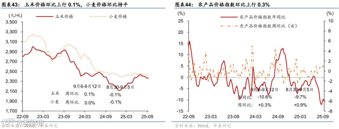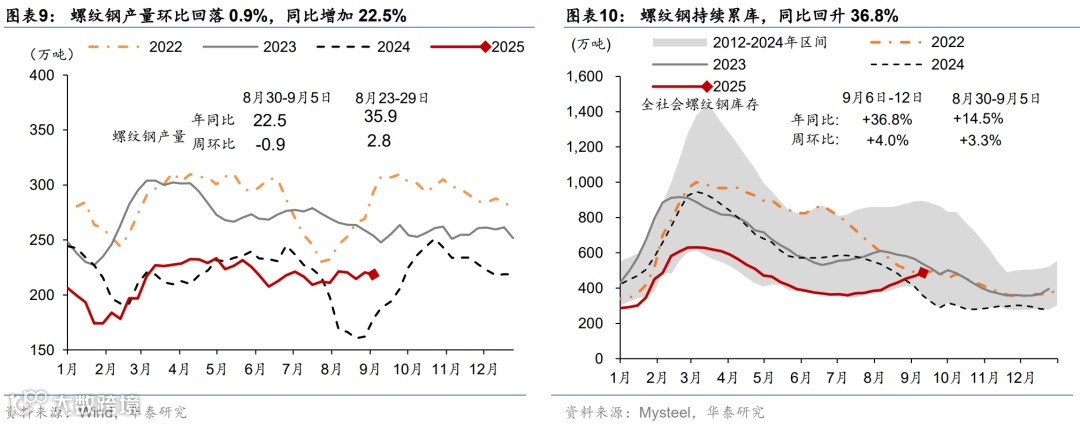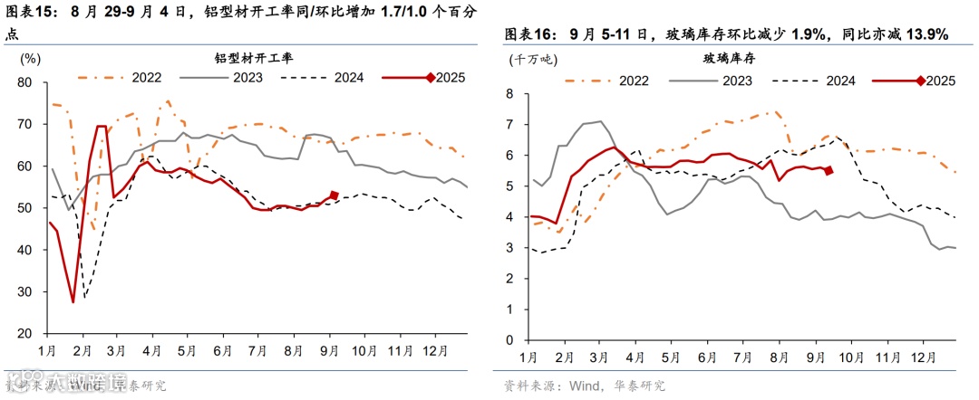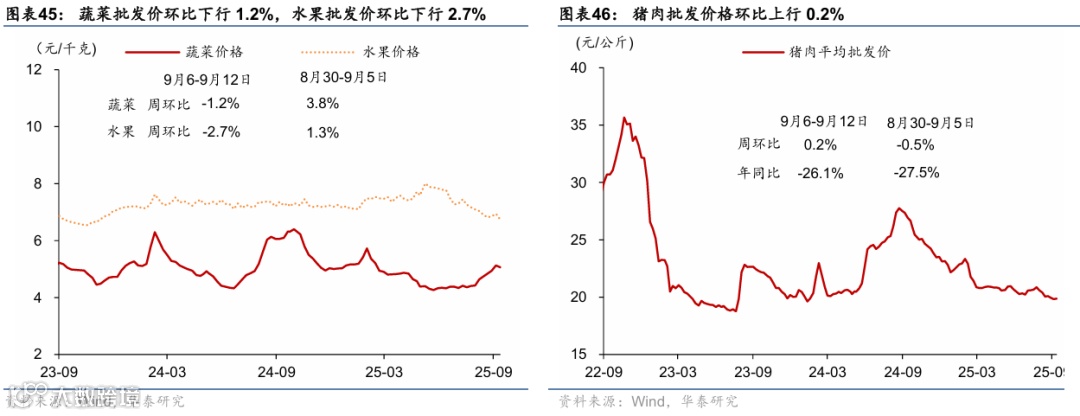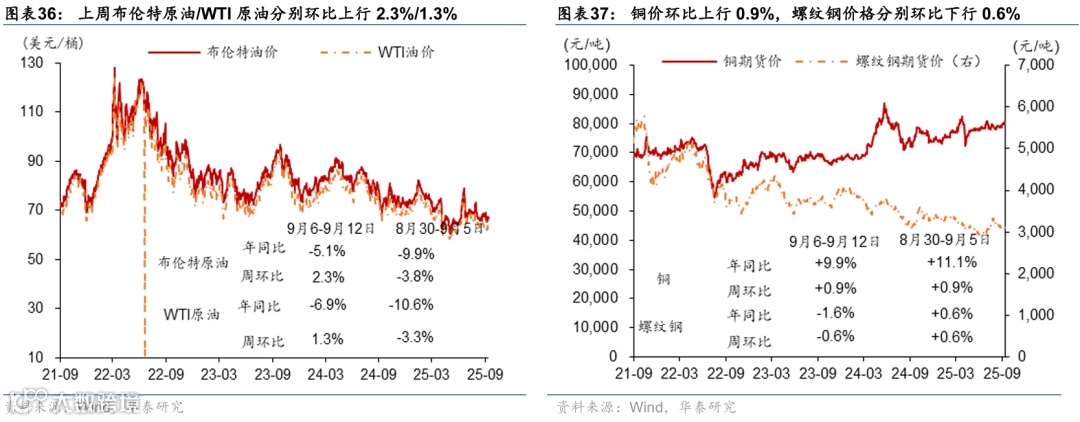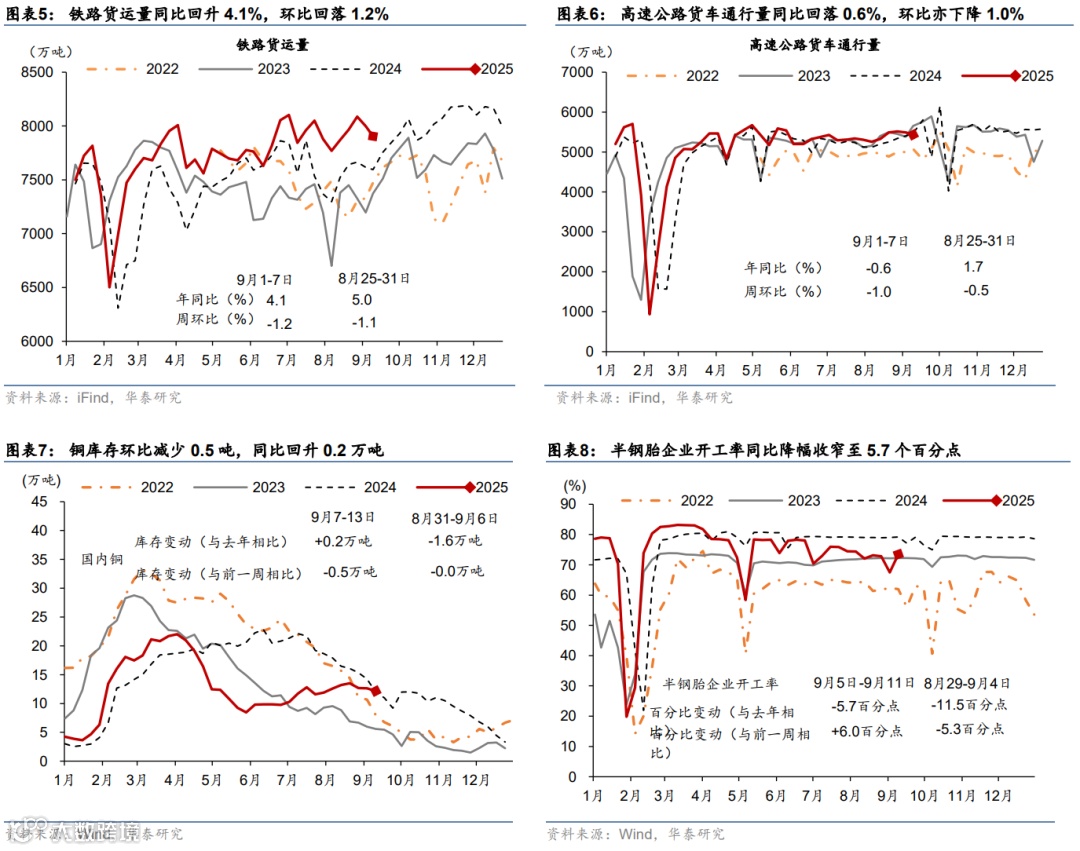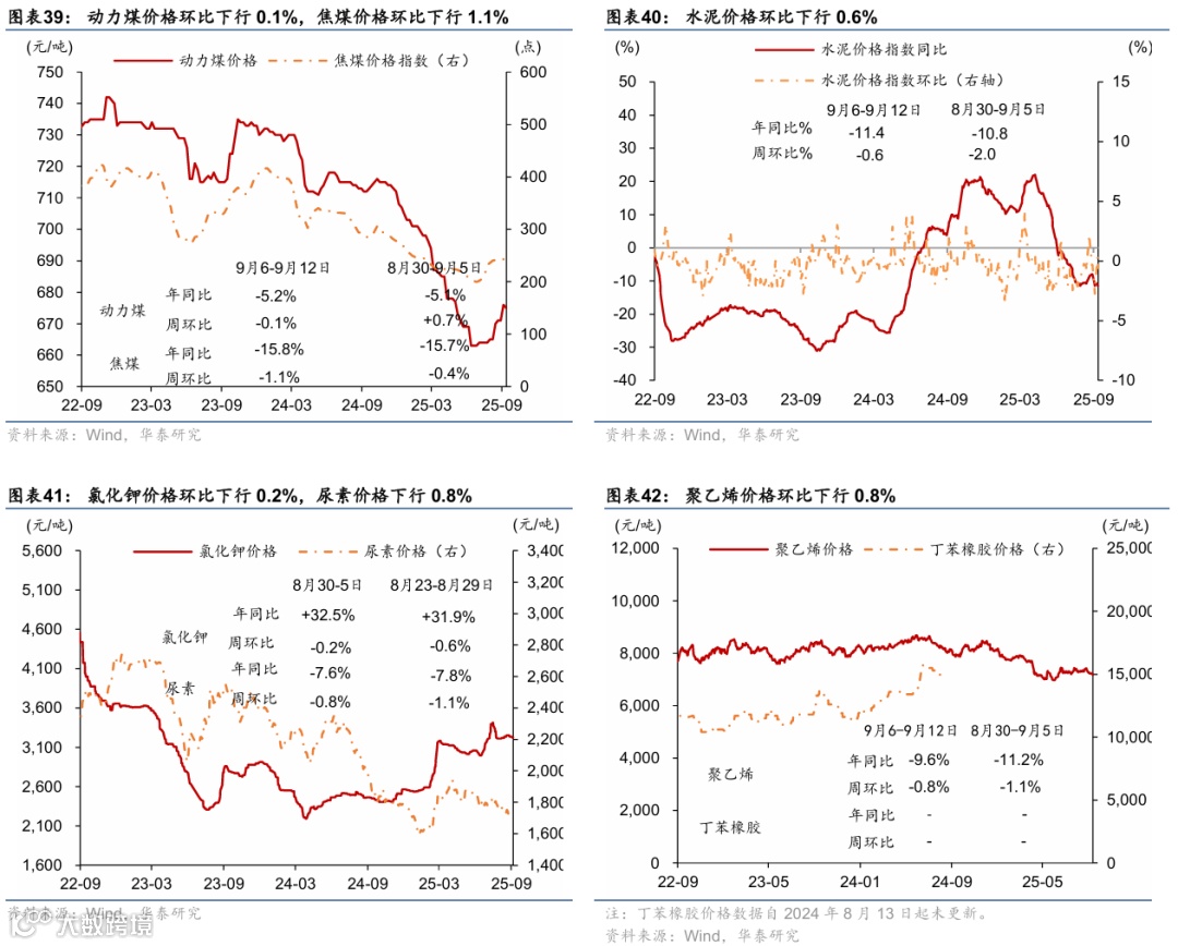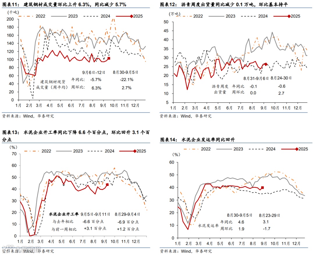 下游:国内建筑开工需求局部改善但整体仍承压,水泥开工率同比下降、环比回升,建筑钢材成交量同比降幅收窄。9月5-11日,水泥企业开工率同比下降6.6个百分点,环比回升至3.1个百分点。9月6 -12日,建筑钢材日均成交量同比降幅由前一周的22.1%收窄至5.7%,环比走高至6.3%。此外,9月5-11日,反内卷政策影响下半钢胎开工率同比下降5.7个百分点,环比增速转正至6.0个百分点;9月6-12日,螺纹钢库存同比高增36.8%,环比增速4.0%。