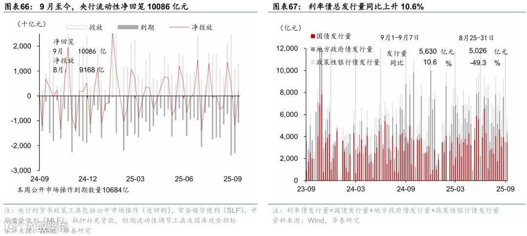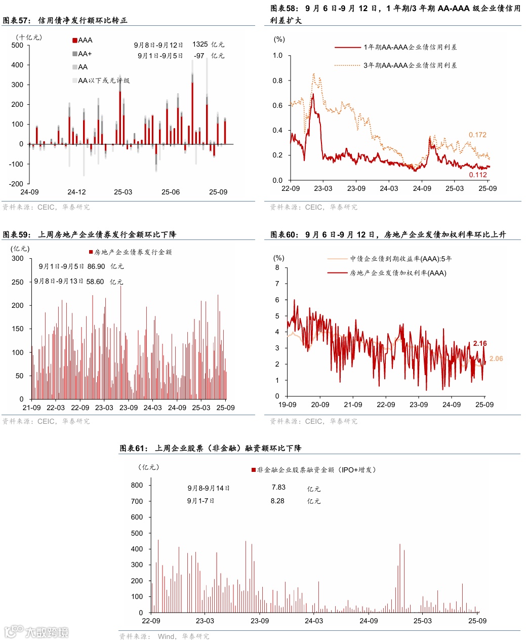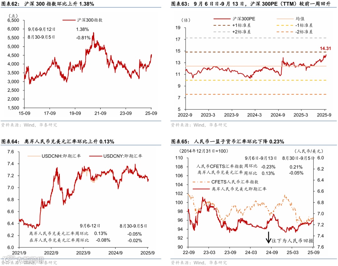 融资及汇率:1年期AA级和AAA级企业债收益率均上升,1年期AA-AAA级和3年期AA-AAA级企业债信用利差均扩大。上周房地产债发行金额环比下降,股权融资额环比下降。指数表现方面,沪深300指数周环比上升1.38%,PE(TTM)估值水平较前一周边际回升。汇率方面,截至9月5日,离岸人民币兑美元汇率较前一周上升0.13%,对一篮子货币汇率环比下降0.23%。上周利率债总发行5,630亿元,国债净发行量同比多增69亿元,地方政府债净发行量同比多增627亿元,利率债净发行量总额同比增加10.6%。