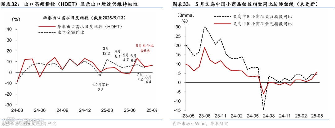 (2)8月出口如期放缓但韧性依然可期。海关总署公布的数据显示,2025年8月美元计价出口同比增速从7月的7.2%回落至4.4%,低于彭博一致预期的5.5%;进口同比增速则从7月的4.1%回落至1.3%,亦低于彭博一致预期的3.4%;贸易顺差上行至1023亿美元、同比多增108亿美元,净出口对经济增长仍形成拉动。往前看,8月全球PMI再度回升至扩张区间,华泰HDET港口高频指标亦显示9月首周出口同比回升,全球财政和资本开支周期等因素仍有望支撑出口韧性。