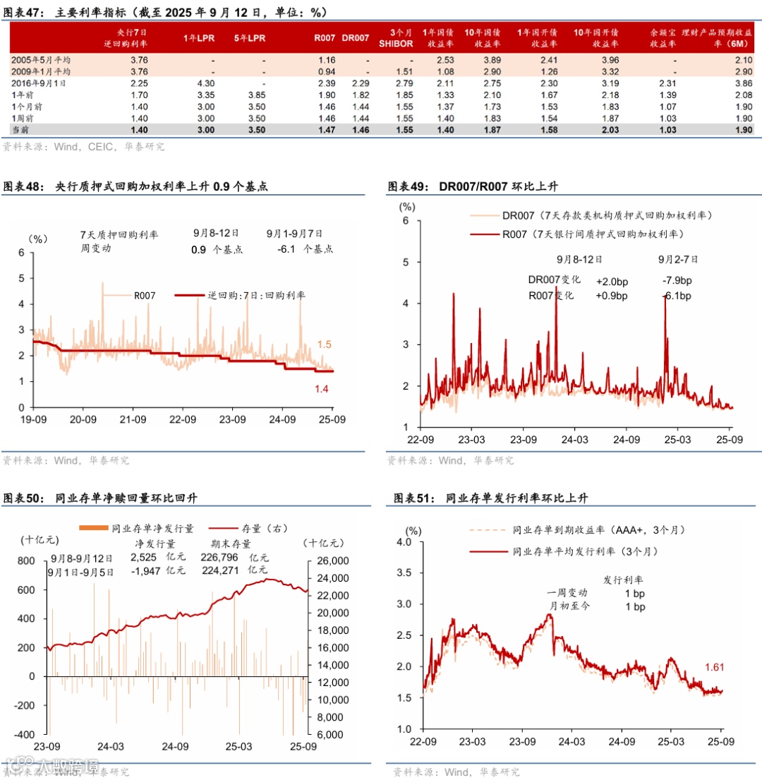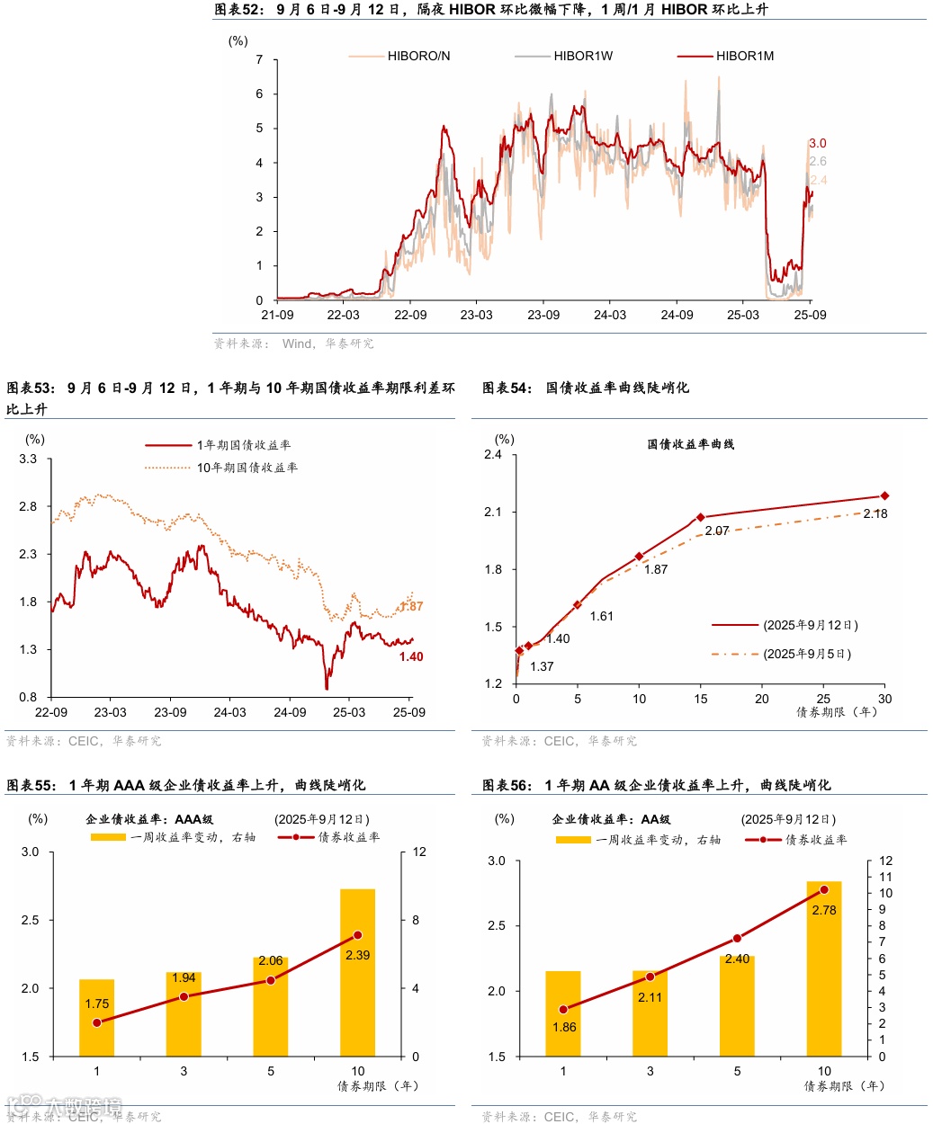 上周二手房成交同比回升,尤其是一线城市延续改善态势。港口高频指标显示出口同比仍维持韧性。工业生产指标同比小幅走强,基建和建筑开工同比降幅边际收窄。8月新增信贷及社融同比少增,而M1同比继续回升,非银存款增加约1.18万亿元,或显示私有部门融资需求偏弱但流动性宽松,居民资金仍在进入股市。部分体现财政支出加速对实体经济现金流形成提振。