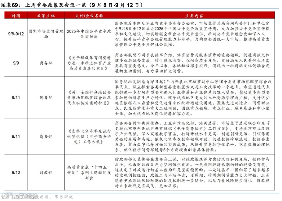 重要事件:1)9月5日,证监会就《公开募集证券投资基金销售费用管理规定(征求意见稿)》公开征求意见。3)9月5日,深圳进一步放松住房限购政策,符合条件的居民家庭在部分区域购房不限套数等。