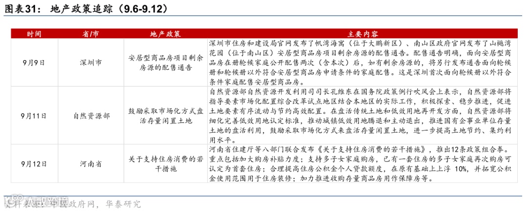 地产政策方面:1)9月9日,深圳市住房和建设局官网发布了帆湾海寓(位于大鹏新区)、南山区政府官网发布了山樾湾花园(位于南山区)安居型商品房项目剩余房源的配售通告。配售通告明确,面向安居型商品房在册轮候家庭公开配售两次(含本次)后,如有剩余房源的,将另行发布通告面向轮候册和轮候册以外符合安居型商品房申请条件的家庭配售。这是深圳首次面向轮候册以外符合条件家庭配售安居型商品房。