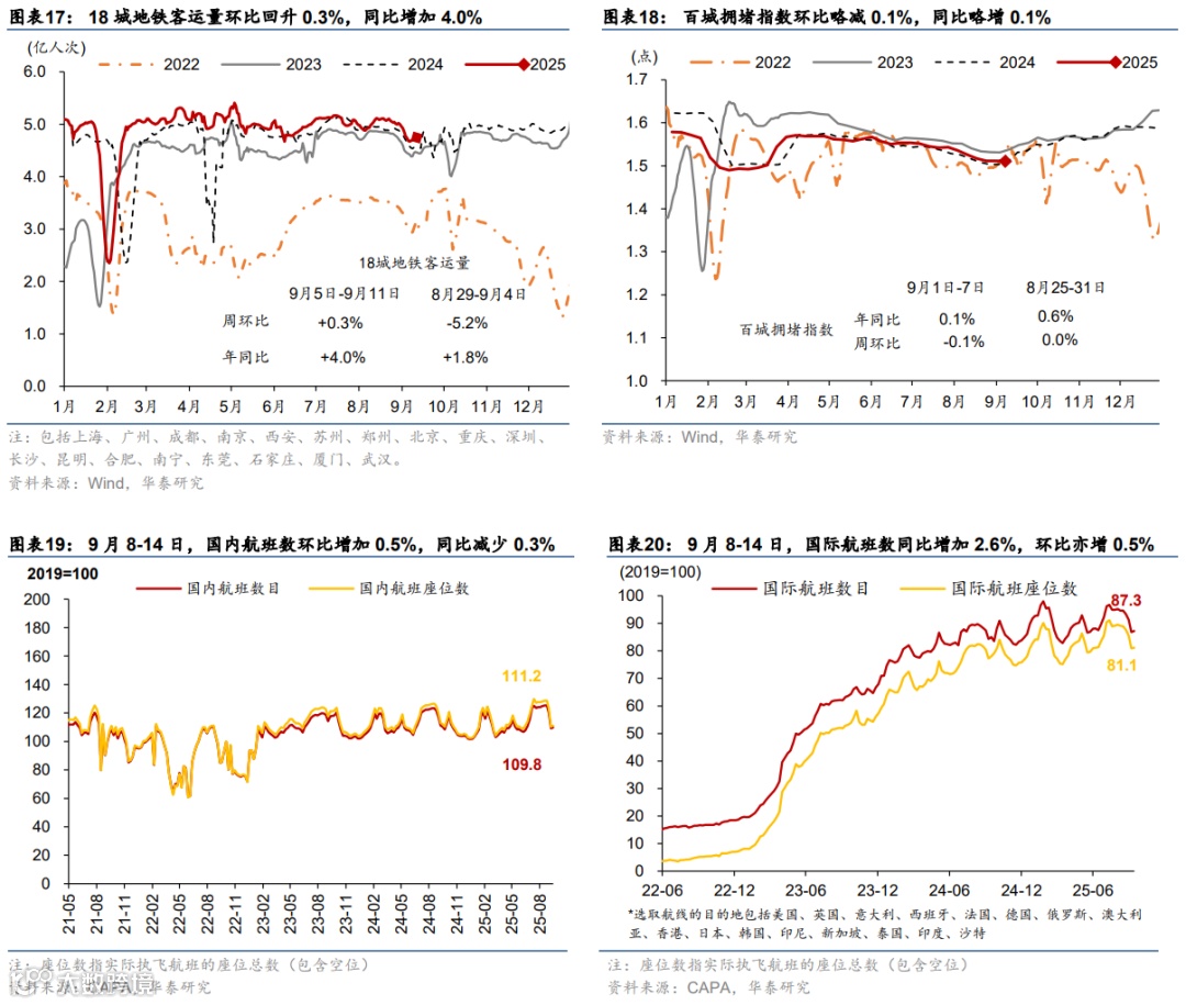 上周居民出行景气度回暖,低基数下工业生产同比稳健,而建筑开工需求仍偏弱,新房成交降幅收窄,二手房成交同比回升,港口高频数据显示出口增速仍维持韧性。出行及消费方面,暑期出行结束,上周国内航班数同比下降0.3%,而国际航班数同比增长2.6%;9月1-7日乘用车销量同比减少10.3%;生产方面,焦化/高炉开工率同比上升7.9/6.2个百分点,建筑钢材成交量低于去年同期5.7%,水泥开工率亦同比下降6.6个百分点。出口方面,HDET 高频指标显示9月1-13日出口同比再度上行至6%左右,9月1-7日铁路货运量同比上升4.1%。地产方面,上周新房成交面积同比降幅由前一周的15.1%收窄至2.9%,二手房成交面积同比由前一周的5.7%加速至13.9%,其中一线城市二手房成交面积同比回升15.7%,或受限购政策优化提振。
