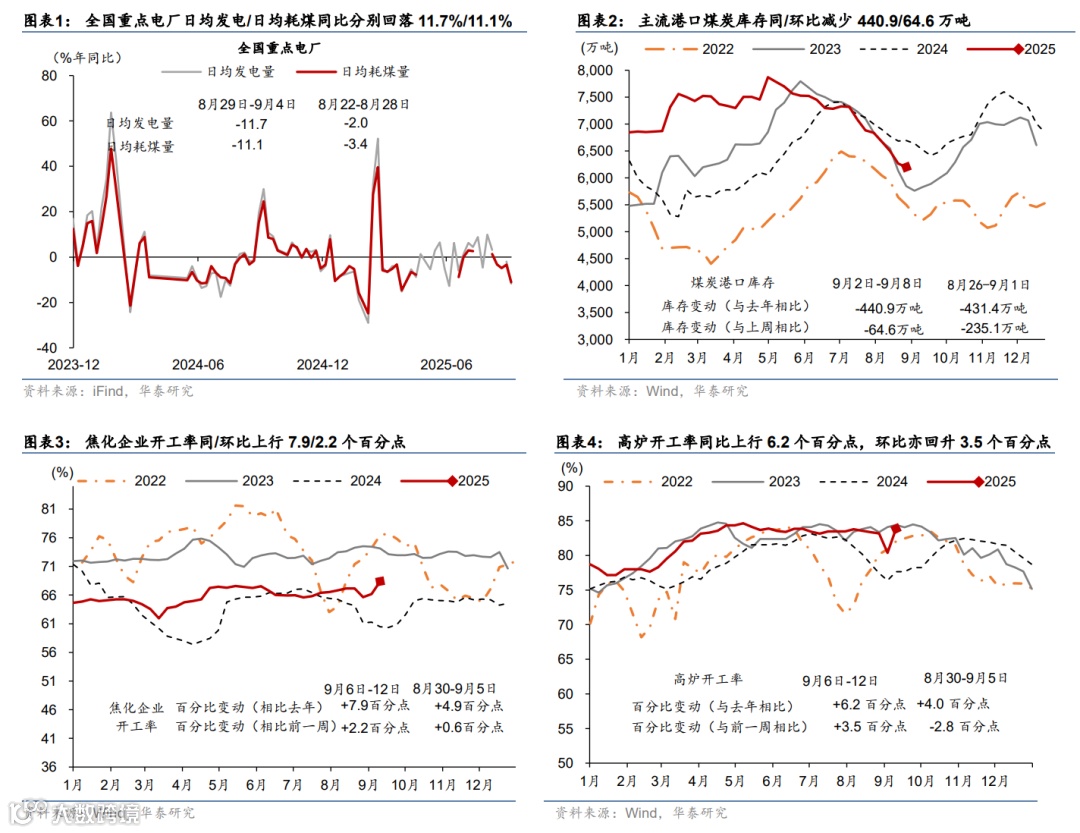 上游:8月29日-9月4日,全国重点电厂发电量和耗煤量同比降幅均走阔;9月2-8日煤炭持续去库;高炉、焦化开工率均高于去年同期。8月29日-9月4日,全国重点电厂日均发电量和耗煤量同比降幅较前一周的2.0%/3.4%分别走阔至11.7%/11.1%。9月2-8日,主流港口煤炭库存环比减少64.61万吨,同比减少440.9万吨。9月6日-12日,焦化企业开工率同比上升7.9个百分点,环比较前一周回升2.2个百分点;高炉开工率同比增加6.2个百分点,环比亦增3.5个百分点。