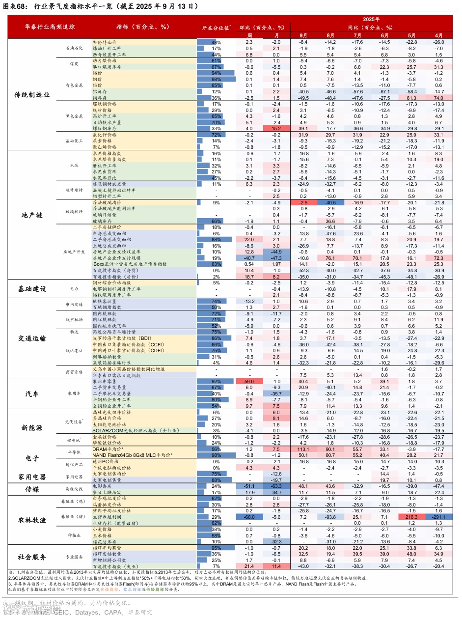 绝对水平:有色金属、航运港口和社会服务等行业景气度相对较高;国际有色金属价格月环比边际回升,光伏产业链价格亦整体上行;从各行业供给、需求/价格所在历史序列的百分位值来看(2013年至今,下同):