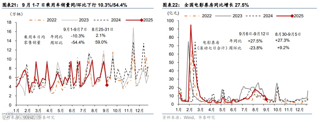 线下消费:乘用车零售同/环比减少,电影票房同比增长。9月1-7日乘用车销量同比减少10.3%,环比亦回落54.4%。9月6-12日,全国电影票房同比较前一周的27.3%略增至27.5%,总体表现维持活跃。