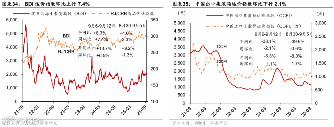 外贸需求:近期国际运价指数环比整体回落,美东美西航运价格环比下行,出口高频指标亦显示9月出口同比增速或上行。BDI指数较前一周环比上行7.4%,中国进口干散货运价指数(CDFI)较前一周环比上行1.1%,中国出口集装箱运价指数亦环比下行2.1%。