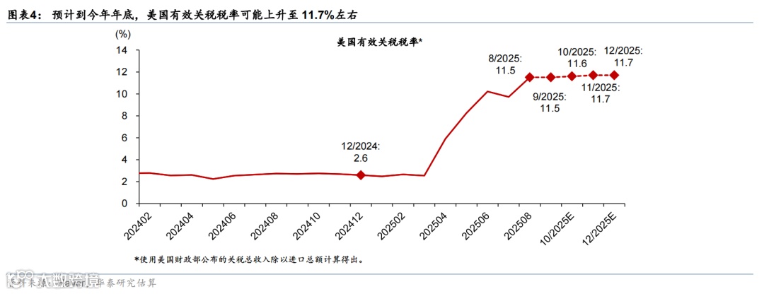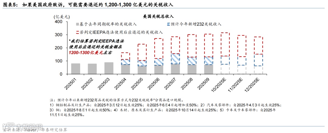 税收返还可能会带来额外“刺激性”效果,尤其是如果和“大而美法案”开始生效的时间形成“共振”的话。如果进行一次性税收返还,特朗普政府可能需要退还约1,200-1,300亿美元的关税收入。具体看,根据美国财政部的关税总收入估算,截至今年8月,美国有效关税税率为11.5%,考虑10-11月即将生效的木材与卡车等232关税,预计到今年年底,美国有效关税税率可能升至11.7%左右(图表4)。基于去年同期的有效关税税率估算、并假设今年8-12月232商品的进口金额与去年持平,预计到今年年底,美国政府基于IEEPA加征的关税收入约为1,200-1,300亿美元(图表5)。如果假设2个季度完成税收返还,相当于短期额外增加年化2,400-2,600亿美元(占2024年GDP的0.8-0.9%)的财政刺激。即便是进行税收抵扣,虽然返还时间可能更长,但也会对经济带来边际宽松的效果。