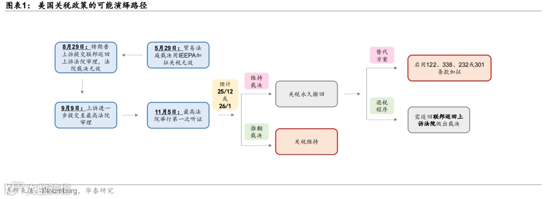 此后,最高法院将最早于12月对援引IEEPA加征芬太尼和对等关税的合法性进行裁决——虽然多数法官在听证会上的态度较为强硬,但最终判决仍有变数。如果特朗普政府要赢得诉讼,至少需要获得最高法院5张支持票。由于最高法院听证会的主要目的是辩论问题,并不像国会或其他政治机构的听证会问题有较强的指示性和引导市场预期的意图。目前在9位大法官中,3位自由派法官大概率投反对票,提出明确质疑的3位保守派法官存在投反对票的可能性,而剩余3位保守派法官投票仍有变数。庭审过后,美国最高法院或将启动判决流程。在加速审理案件的情况下,预计最早今年12月美国最高法院将宣布判决,最晚可能不迟于明年1月(图表1)。届时如果需要返还之前征税的关税或者进行税收抵扣,美国最高法院可能会下发到联邦巡回上诉法院来执行。