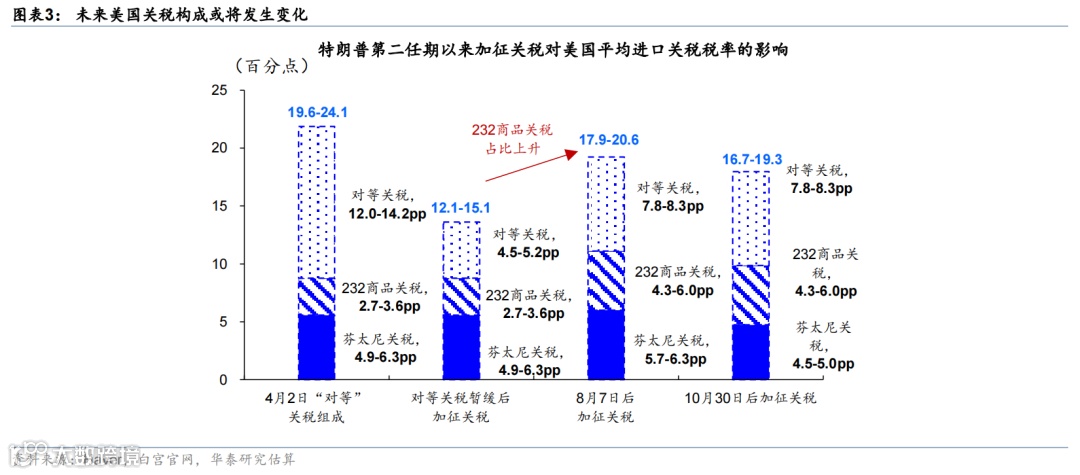 《法院裁决能阻止特朗普加征关税吗?》(2025/5/30)中分析,特朗普政府可能会通过援引其他法案(如122、338等条款)来暂时维持目前对全球加征15%左右的关税,同时基于232、301调查对特定行业、个别国家进一步加征关税,由此美国总关税水平可能会大体保持不变,但总关税的构成可能发生变化(图表2和3)。具体看,特朗普政府可以使用的替代性关税政策主要有以下四种——其中122和338关税可能二选一执行,而232 和301关税调查可能在此前两项基础上平行推进: