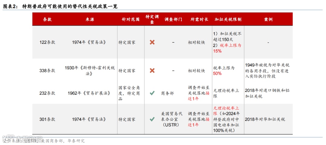4) 同时,特朗普还可以(平行)通过301条款对主要贸易伙伴征收国别关税:《1974年贸易法》第301条授权美国贸易代表办公室(USTR)调查外国“不公平、不合理或歧视性”贸易行为,并采取报复措施。2018年美国曾对华发起301调查并通过301条款加征关税。