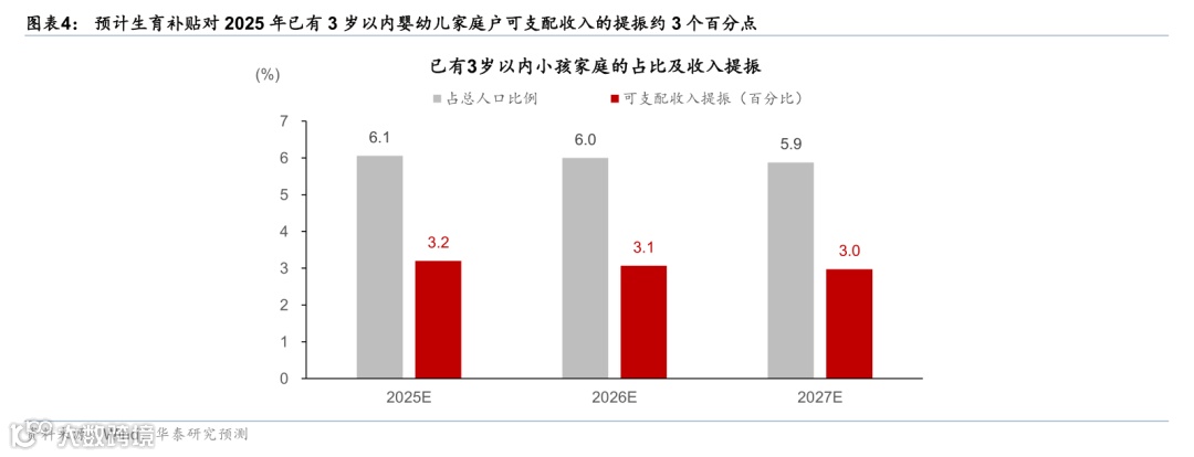 2.对于定向补贴家庭,生育补贴占该群体年可支配收入的比例或约为3%,对被补贴家庭的定向支出费用,可能提振效果比较为明显,有望拉动育儿相关支出增长,但对比海外国家政策力度仍有进一步上升的空间——比如德国自2021 年起宣布新生儿每月补贴219-250 欧元,持续发放至18 岁,日本每位新生儿从出生至高中毕业可以按月领取合计约234万日元的津贴(图表6)。我们参照2021-2024年新出生人口年化增速及七普数据中的户均人口进行估算,未来三年,全国3岁以下婴幼儿的家庭或达8200-8600万户,占总家庭户数的约6%,年化生育补贴金额1200亿元约为该群体总可支配收入的约为3%(图表4)。