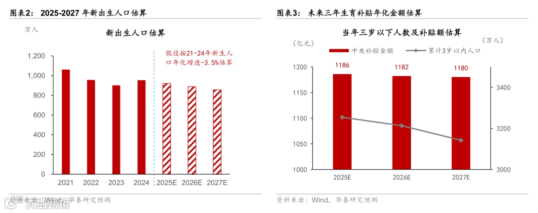 1.全国宏观层面,参照国家基础标准,我们估算2025-2027年三年生育补贴年化金额约为1200亿元,约占2024年名义GDP的0.1%,占2024年居民消费总额的约0.2%,对整体GDP及居民消费的拉动效果或偏温和。其中,对2025年1月1日之前出生、不满3周岁的婴幼儿,我们参照应补贴月数折算,假设出生人数月份平均分布,2025-2027年新出生人口增速延续2021-2024年的年化降幅3.5%(图表1-3)。