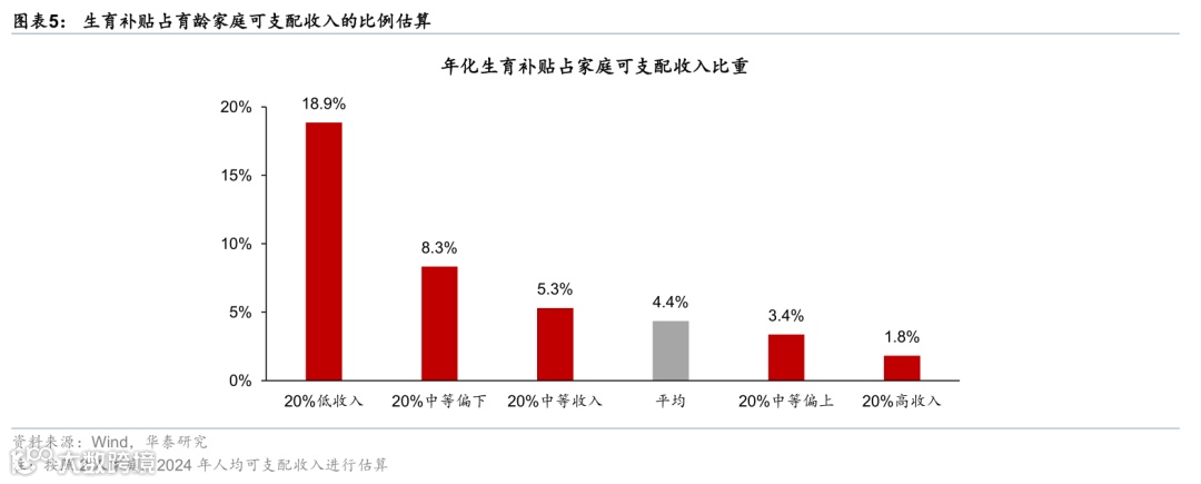 3.对于育龄家庭的激励效果而言,我们估算生育补贴占二人家庭可支配收入的比例约为4-5%,但针对不同收入水平的家庭效果呈现分化,对中低收入人群的激励效果或更为明显——对于20%低收入、20%中等偏下收入户而言,该生育补贴占年可支配收入的比例分别约为19%、8.3%、明显高于平均水平,或呈现较为有效的激励效果,而对于20%的高收入人群而言,生育补贴仅占年可支配收入的不到2%,效果或较为温和(图表5)。