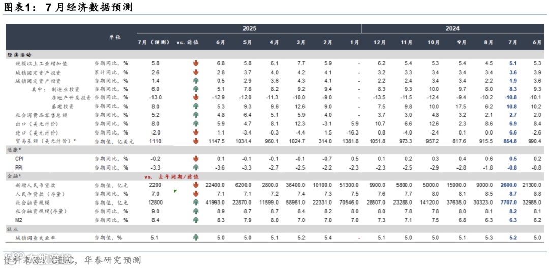 通胀:我们预计7月CPI同比回落至-0.2%左右,“反内卷”修复预期推动PPI同比降幅收窄至3.3%。7月农产品价格延续分化走势,猪肉价格止跌回升,环比上涨2.2%,但同比仍下降18.4%;玉米/小麦价格环比分别下跌1.2%/0.4%。7月国内机票价格延续回升态势,同比降幅较前期明显收窄,显示出暑期出行需求持续修复;此外,7月油价有所回升,布伦特油价环比上涨8.3%,同比下降9.3%;高频指标显示水泥企业开工率环比回升2.1%,建筑钢材成交量环比回升17.7%。虽然供给端已有部分减产、限产措施开始落地,但整体效果仍有待进一步观察。