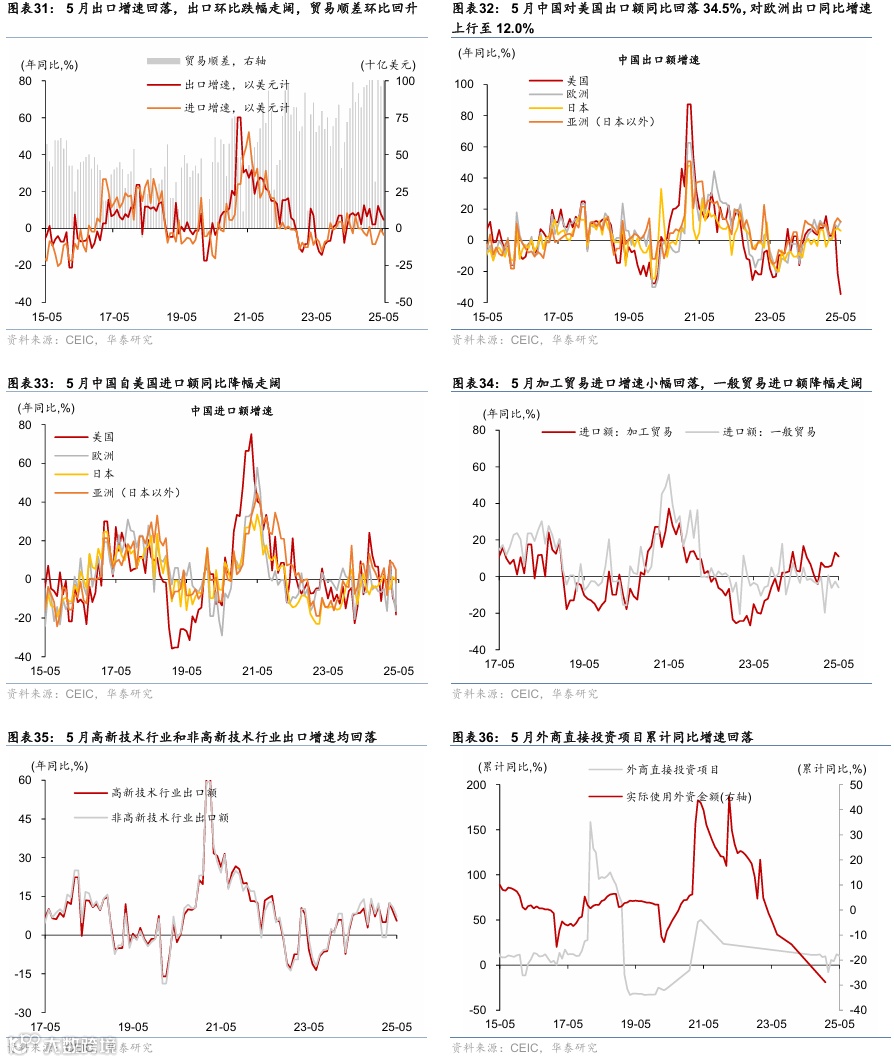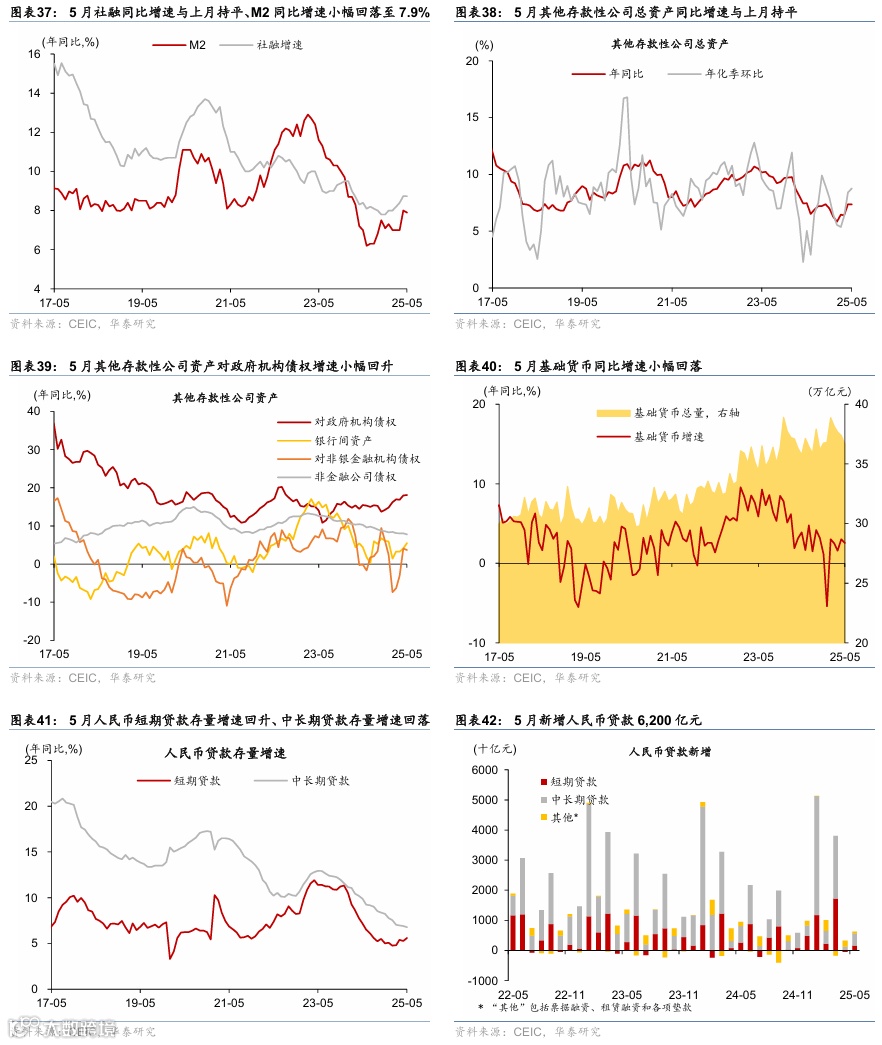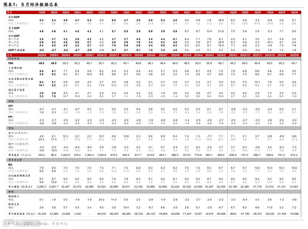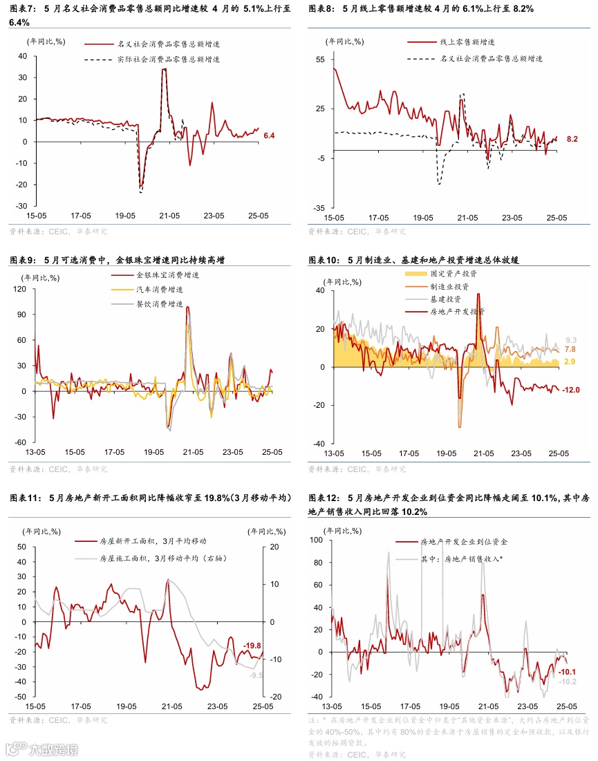 5月重要宏观数据回顾:1)5月社零同比较4月的5.1%回升至6.4%,而工业增加值/固定资产投资同比回落至5.8%/2.9%;2)5月出口同比增速从4月的8.1%回落至4.8%,对美出口进一步回落,对东盟、欧盟出口维持高增;进口同比从4月的-0.3%回落至-3.4%;3)5月新增人民币贷款6,200亿,同比少增3300亿元;新增社融2.29万亿元,低基数下同比多增2,247亿元;M1同比增速从4月的1.5%回升至2.3%,M2同比增速从4月的8%小幅回落至7.9%。4)5月CPI同比持平于4月的-0.1%;PPI同比降幅走阔至3.3%。