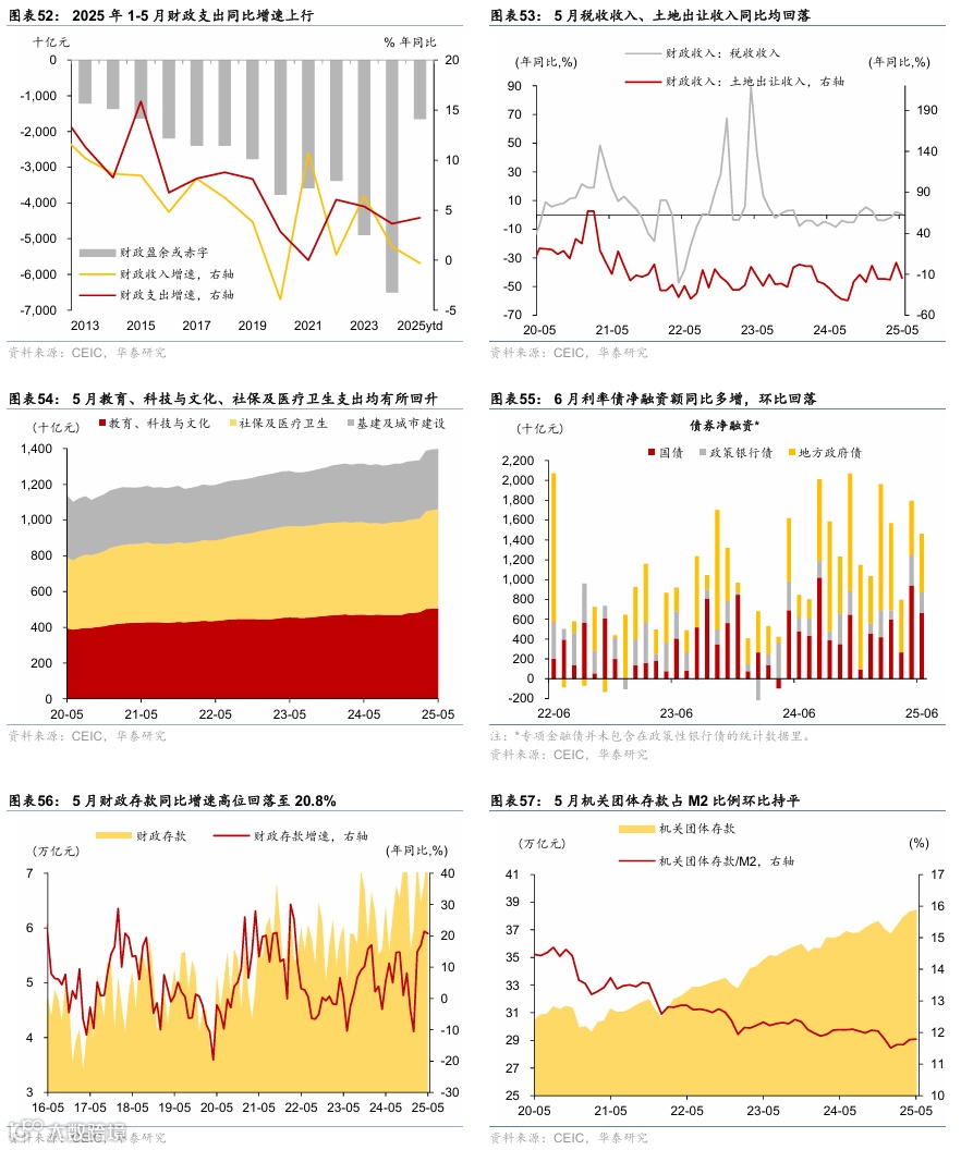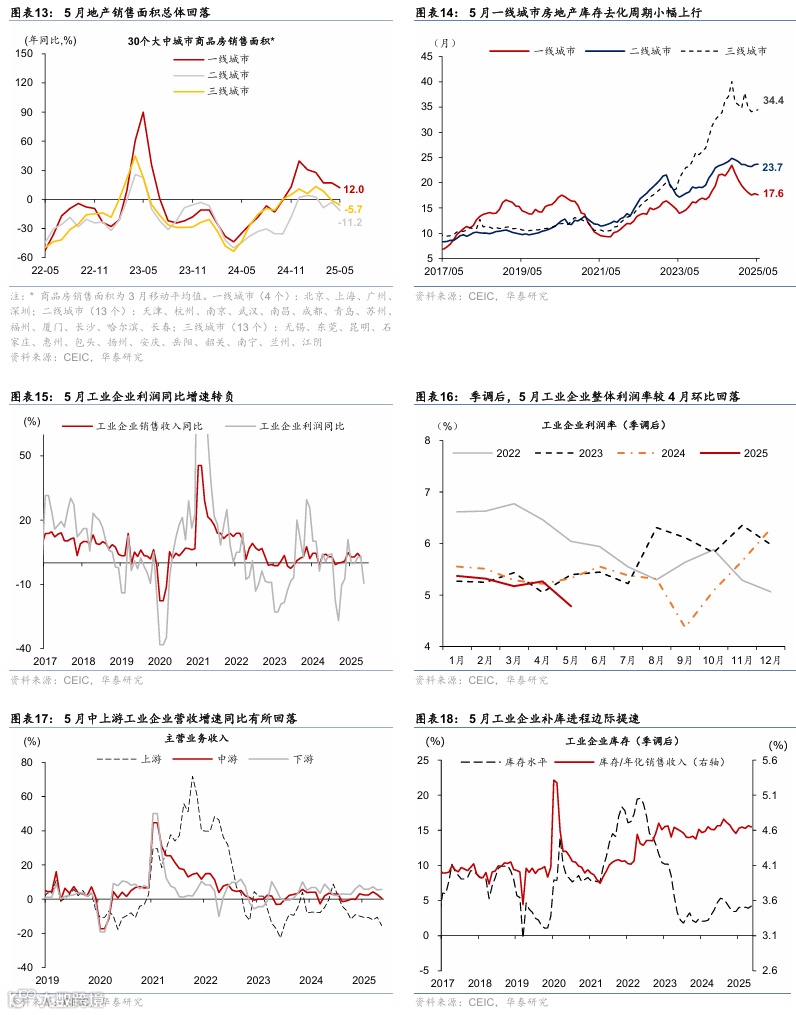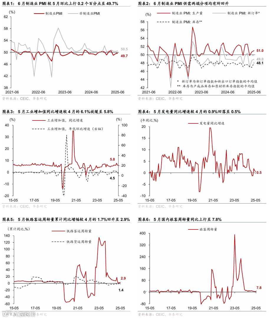 季调后财政支出力度在二季度以来环比回落,关税对企业利润率的影响逐步凸显,同时6月高频指标显示地产销售走弱,消费或受购物节提前、补贴退坡及违规吃喝监管等影响回落。但6月政府融资有所提速,有望对基建开工形成支撑。整体而言,低基数下经济同比指标或维持韧性,总需求环比增长动能或呈现阶段性减速。出行及消费方面,6月1-28日,18城地铁客运量同比上升1.6%,国内/国际航班数同比走高1.3%/6.9%;6月1-22日,乘用车日均零售销量同比较5月的13%上行至24%。出口方面,HDET高频指标显示6月1-27日出口同比增速或较5月小幅回落。制造业开工维持韧性:6月焦化/高炉开工率高于去年同期2.2/1.3个百分点,水泥开工率同比回落3.5个百分点,建筑钢材成交量亦低于去年同期16.1%。地产方面,6月1-29日,44城新房/22城二手房成交面积同比增速较5月的-5.9%/5.8%回落至-17%/-4%,其中一线城市新房成交面积同比较5月的20.5%回落至-17%。