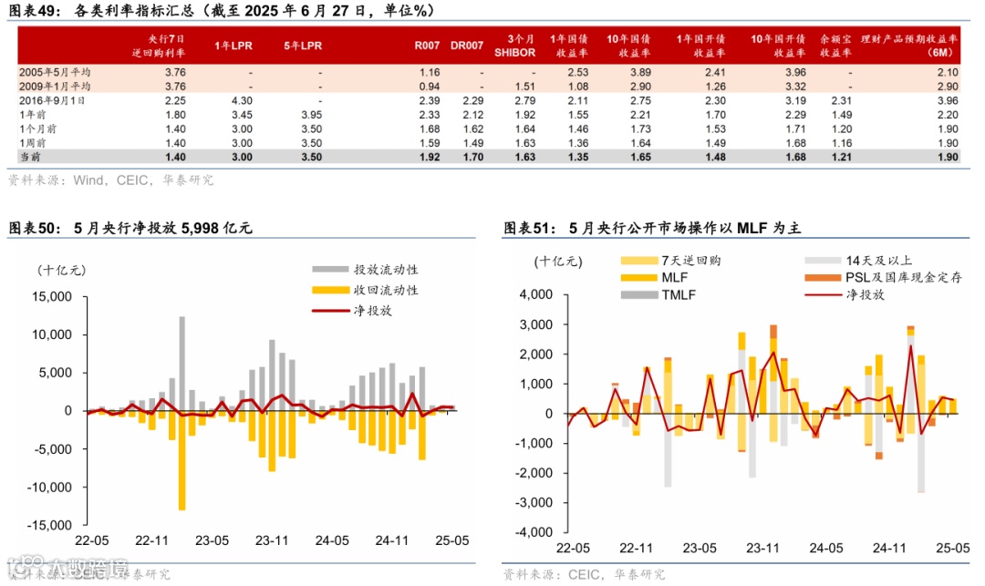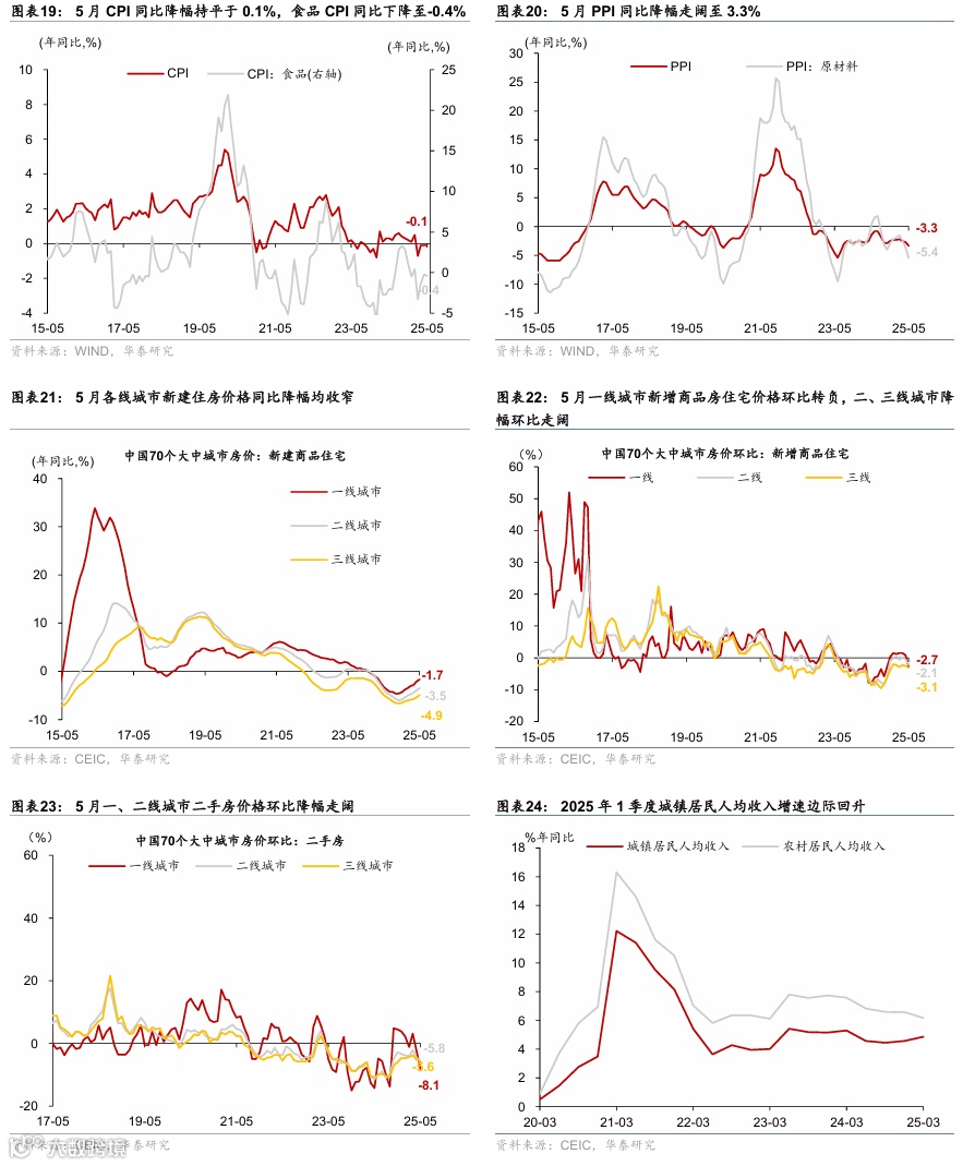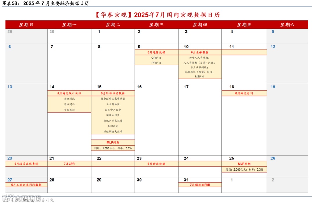政策及事件:1)6月9-10日,中美经贸磋商机制首次会议在伦敦举行,进一步稳定中美双边经贸关系。2)6月13日,国常会提及更大力度推动房地产市场止跌回稳,首次提出摸底全国已供土地和在建项目。3)6月18日,央行行长潘功胜宣布8项金融开放措施,聚焦金融基础设施、数字金融、跨境贸易和监管创新。4)6月23日,央行2季度货币政策委员会例会强调关注物价低位运行。5)6月24日,多部门联合发布《关于金融支持提振和扩大消费的指导意见》,从支持增强消费能力、扩大消费领域金融供给等六个方面推出19条重点举措。