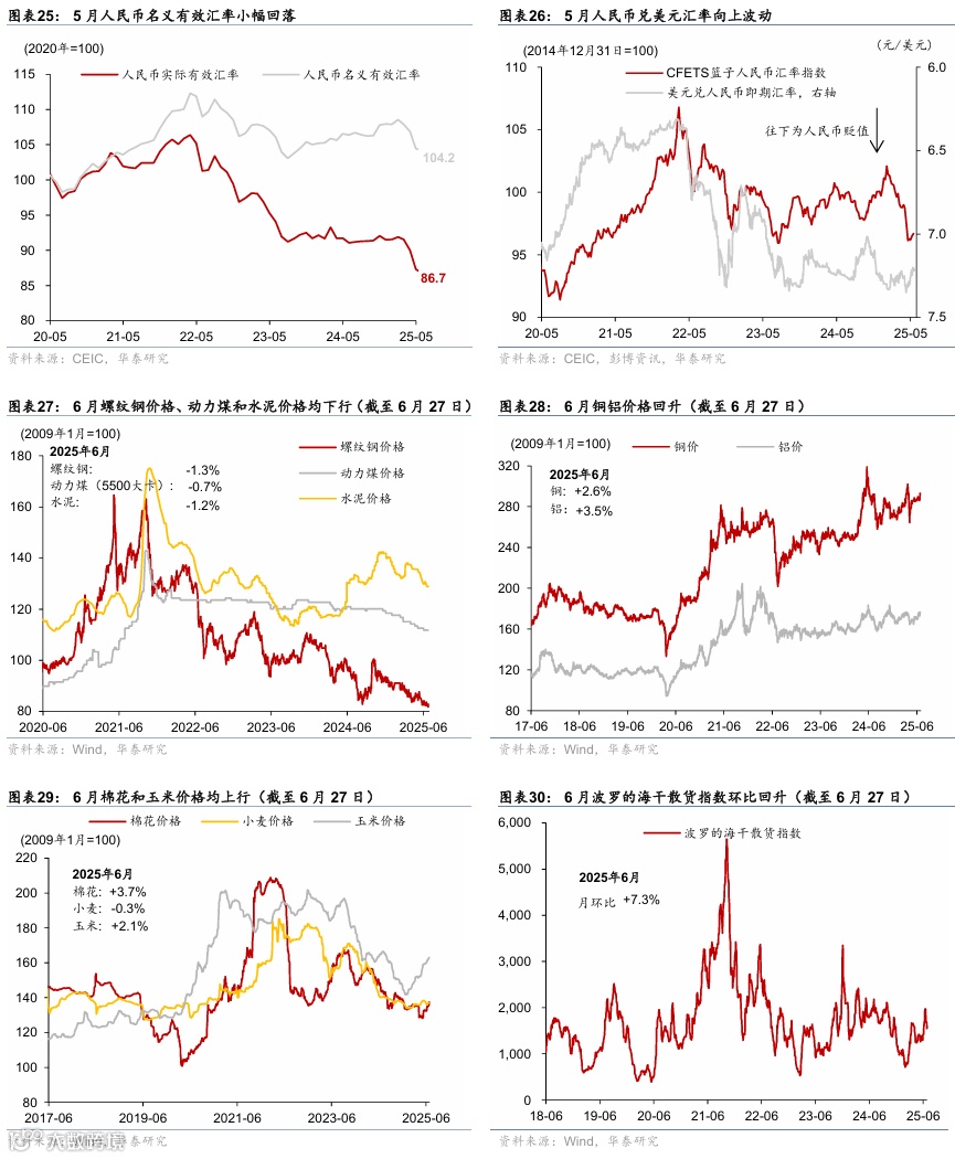 通胀:地缘冲突扰动下国际油价低位回升,国内原材料价格表现分化。截至6月27日,布伦特油价月环比回升6.1%至67.8美元/桶,而COMEX黄金月环比回落0.8%至3,288美元/盎司。国内原材料价格涨跌互现,铜/铝价环比走高2.6%/3.5%,而螺纹钢/水泥价格环比回撤1.3%/1.2%。农产品价格方面,猪肉/水果价格环比回落2.1%/7.3%,而蔬菜价格环比略上涨1.2%。