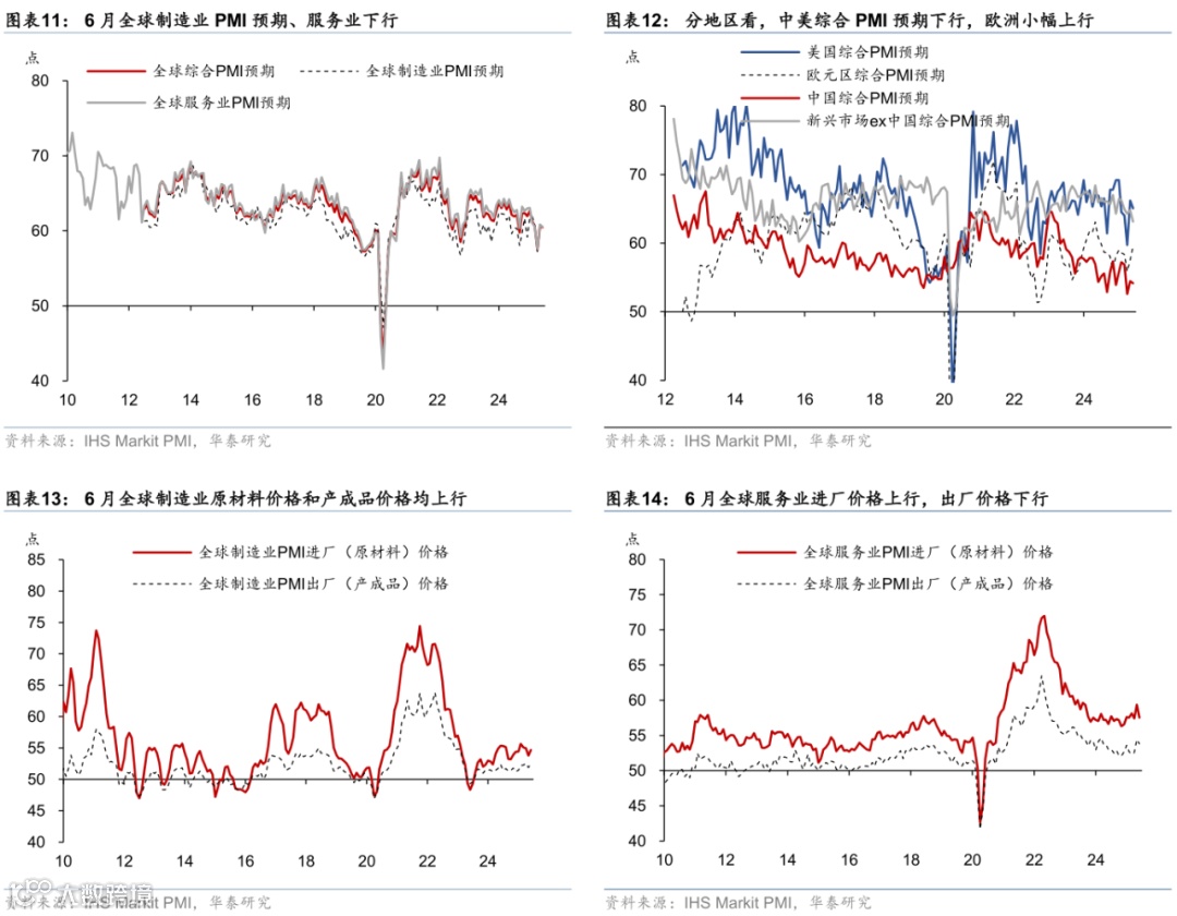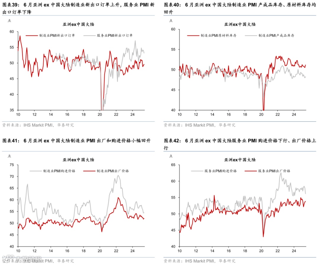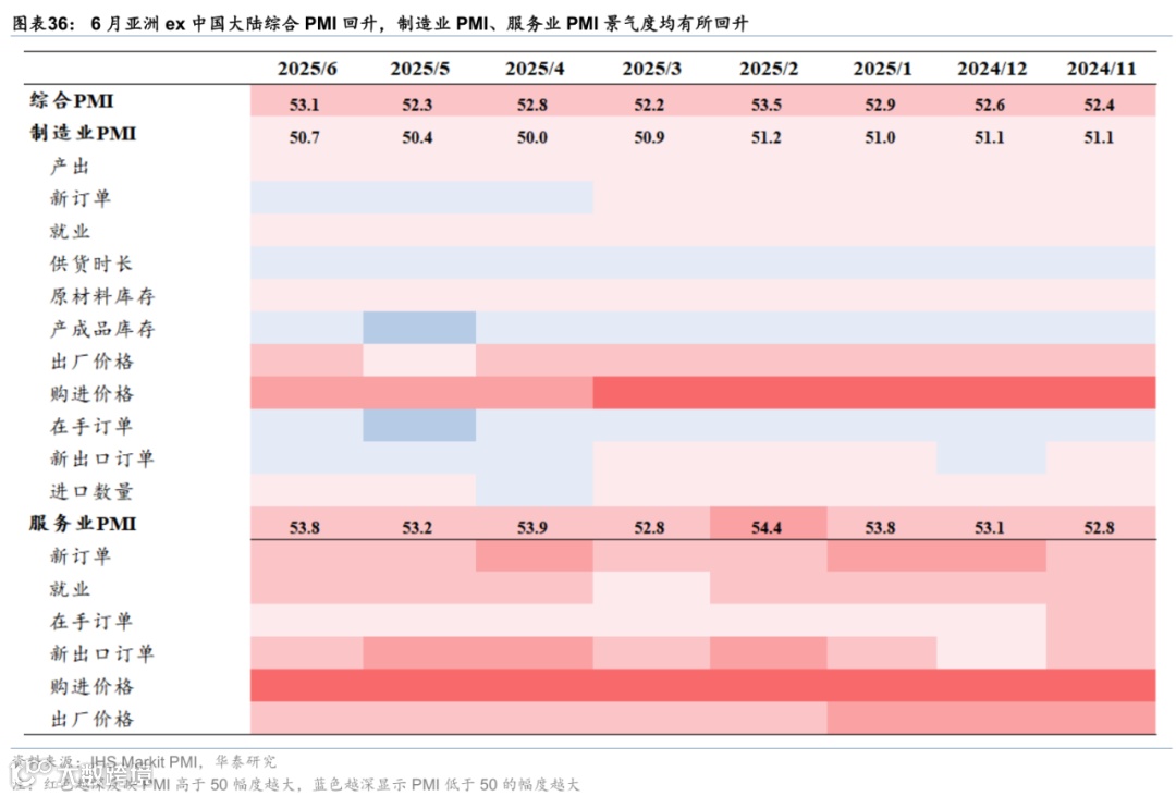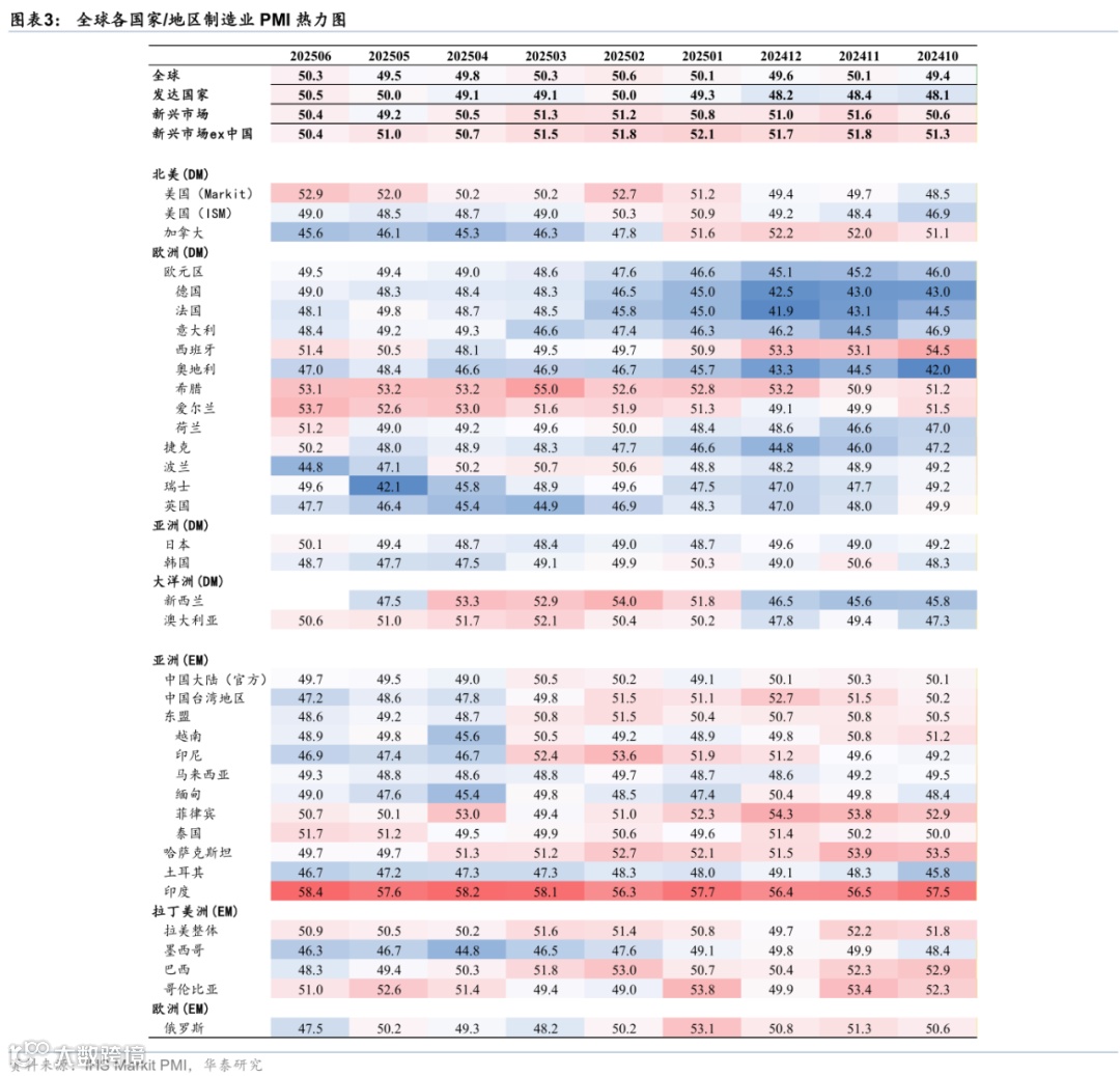 6月全球制造业PMI上升0.8pp至50.3,发达国家多数回升,新兴市场国家喜忧参半善。发达国家回升0.5pp至50.5,其中美国Markit上行至52.9,ISM则上行0.5pp至49,显示关税对美国制造业的冲击尚不明显;欧元区PMI略微上行0.1pp至49.5,其中德国和西班牙走强,而法国和意大利回落;英国则延续低位回升;日本亦上行0.7pp至50.1,时隔一年重回荣枯线以上。新兴市场经济体从49.2回升至50.4,新兴市场ex中国大陆回落0.6pp至50.4;其他主要国家与地区中,韩国、印度分别回升1.0pp、0.8pp,中国台湾地区、越南、印尼均明显回落。