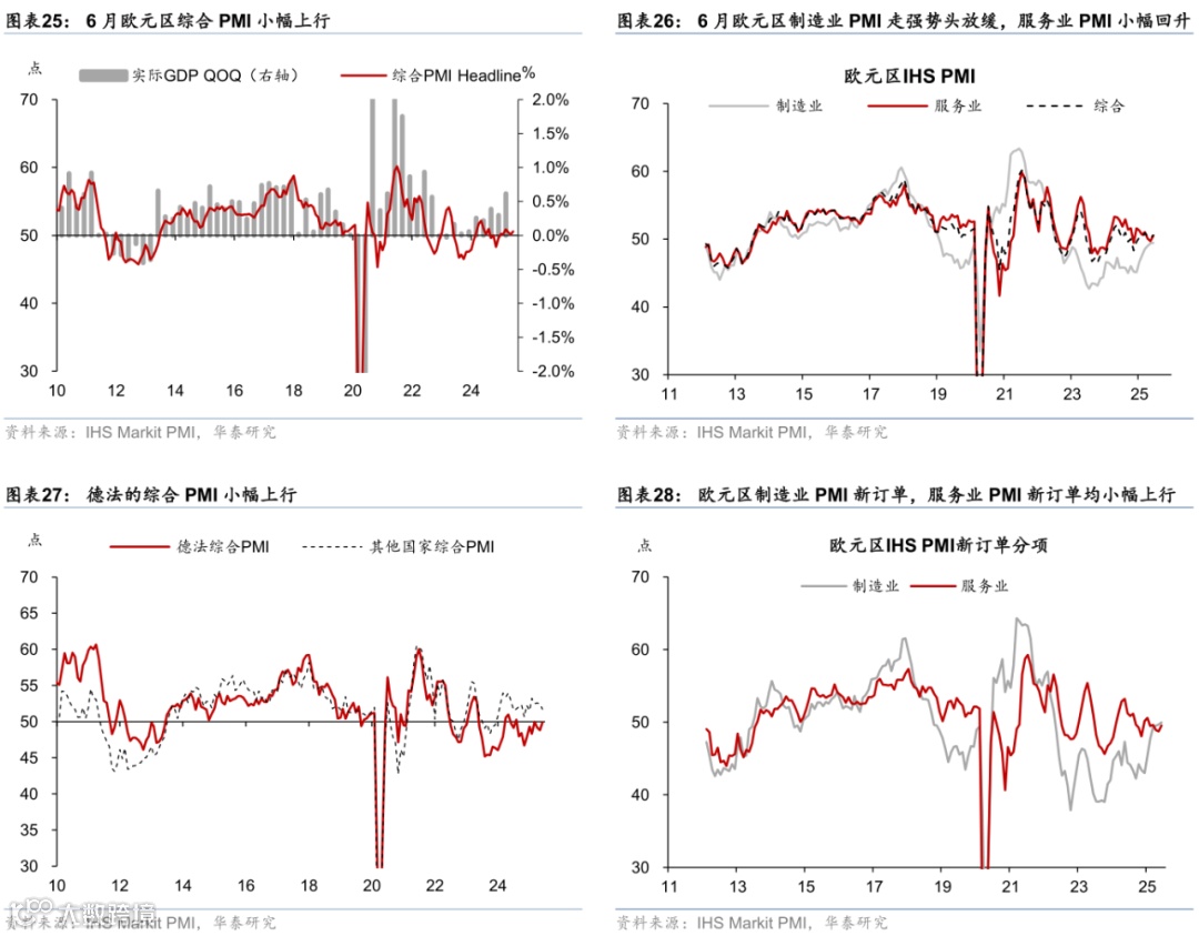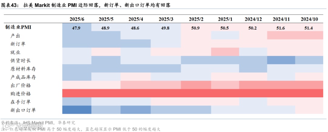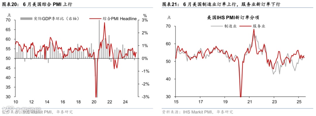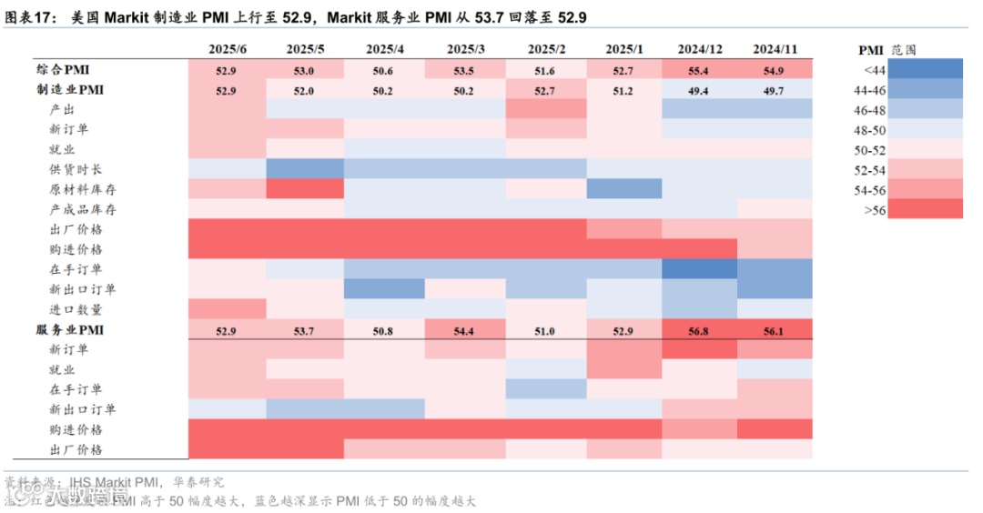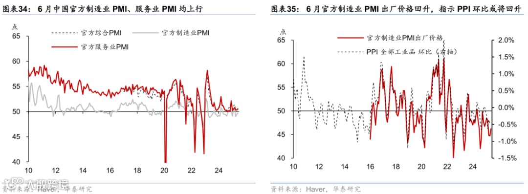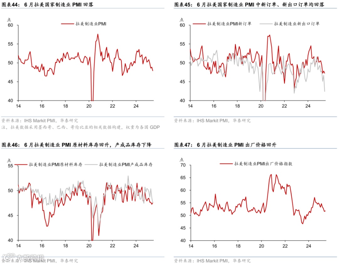 6月全球制造业PMI上升0.8pp至50.3,发达国家多数回升,新兴市场国家喜忧参半善。发达国家回升0.5pp至50.5,其中美国Markit上行至52.9,ISM则上行0.5pp至49,显示关税对美国制造业的冲击尚不明显;欧元区PMI略微上行0.1pp至49.5,其中德国和西班牙走强,而法国和意大利回落;英国则延续低位回升;日本亦上行0.7pp至50.1,时隔一年重回荣枯线以上。新兴市场经济体从49.2回升至50.4,新兴市场ex中国大陆回落0.6pp至50.4;其他主要国家与地区中,韩国、印度分别回升1.0pp、0.8pp,中国台湾地区、越南、印尼均明显回落。