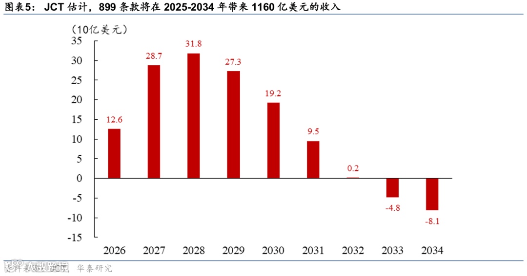 899条款为财政收入开源,降低“大而美”法案的财政成本。“大而美”法案延长减税以及新增支出将明显推高未来十年美国财政赤字,899条款如果落地可能一定程度抵消“大而美”法案的财政成本。税收联合委员会(JCT)估计,众议院版本的899条款将在2025-2034年带来1160亿美元的收入,但由于899条款可能导致海外投资撤出美国,JCT估计显示2023-2034年899条款将导致税收下降而不是上升(图表5)。由于参议院对899条款进行了调整,其对财政成本的影响或不及上述测算。