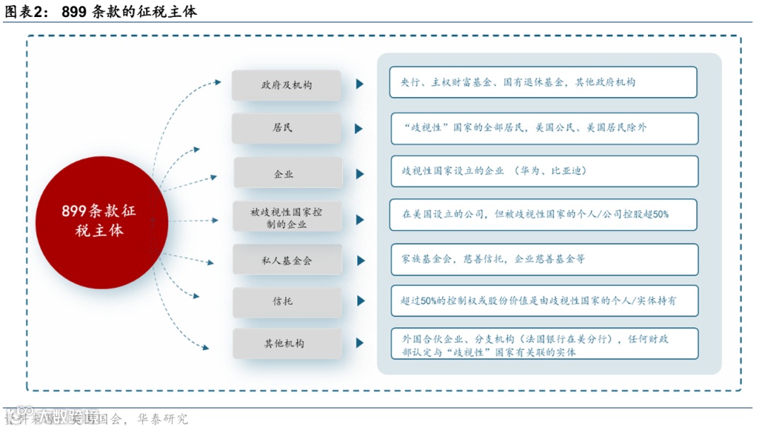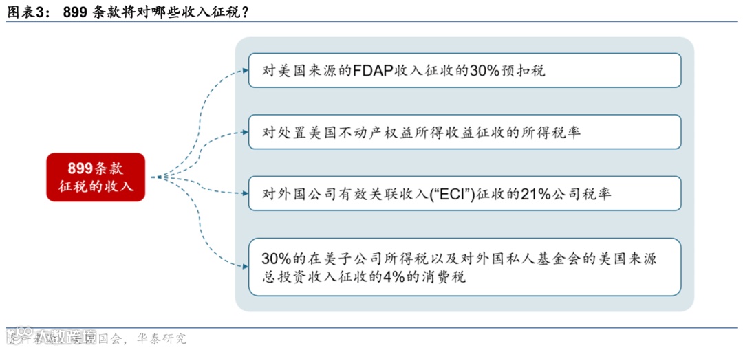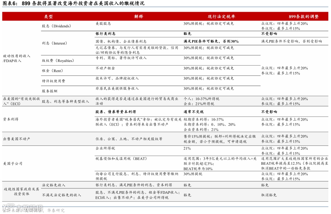 股息、部分利息、版税等被动性收入将缴纳30%“预提税”(provision tax)。899条款导致税率额外上升15-20pp。