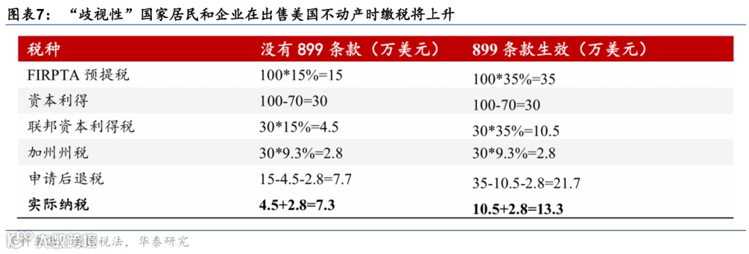 歧视性国家居民和企业出售美国不动产时面临的FIRPTA 预提税和联邦资本利得税税率均将上升。如前所述,海外居民和企业出售美国不动产需要按照售价缴纳15%的FIRPTA 预提税,最终缴税额取决于联邦资本利得税以及州资本利得税。899条款明确规定,“歧视性”国家居民和实体所面临的FIRPTA 预提税和联邦资本利得税税率均将上升,最大上行幅度是15-20个百分点。举例来看,2025年法国投资者以70万美元购买加州一套公寓,2030年以100万卖给美国居民用于自住,没有899条款的情况下,出售时FIRPTA预提税为15万,由于该投资者需要缴纳的联邦资本利得税和加州资本利得税为7.3万,因此可以申请退税7.7万美元。如果899条款生效,且 4年将FIRPTA预提税税率和联邦资本利得税税率各提高20个百分点,则FIRPTA预提税为35万,由于需要缴纳的联邦资本利得税和加州资本利得税为13.3万,最终可申请退税21.7万美元(图表7)。