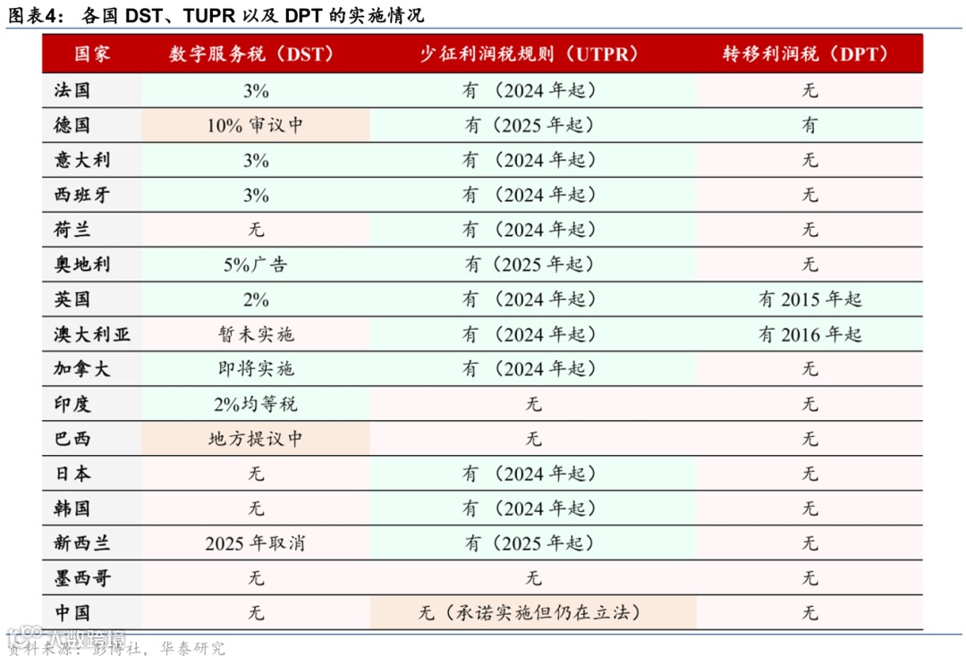 目前欧洲国家被加征反歧视税收的风险较大,其次是日本、韩国等。从数字服务税(DST)来看,法国、意大利、西班牙、英国都已经实施2-3%的数字服务税。德国虽然没有正式落地数字服务税,但德国政府已制定将大型在线平台(如 Google、Meta/Facebook)纳入税收范围的立法草案,拟对其在德国产生的数字广告等收入征收 10% 税率,若上述法案通过,德国将于2026年初实施。从少征利润税(UTPR)来看,大多数欧盟国家已经从2024年开始实施UTPR。从转移利润税(DPT)来看,目前仅英国和澳大利亚分别于2015年和2016年实施。因此,主要欧洲国家可能因为实施DST以及UTPR而被例如歧视性国家清单被加征反歧视性税收。据彭博社报道,有迹象表明欧洲国家愿意修改其政策,以安抚特朗普政府。日本、韩国等国家也面临一定风险。日本、韩国、新西兰均于2024年实施了UTPR,因而面临被加征反歧视税收的风险。新西兰曾于2023年8月推出数字服务税法案,对全球数字服务巨头征收3%的数字服务税,但2025年5月21日宣布撤回,主要原因是担心美国可能采取报复性关税。