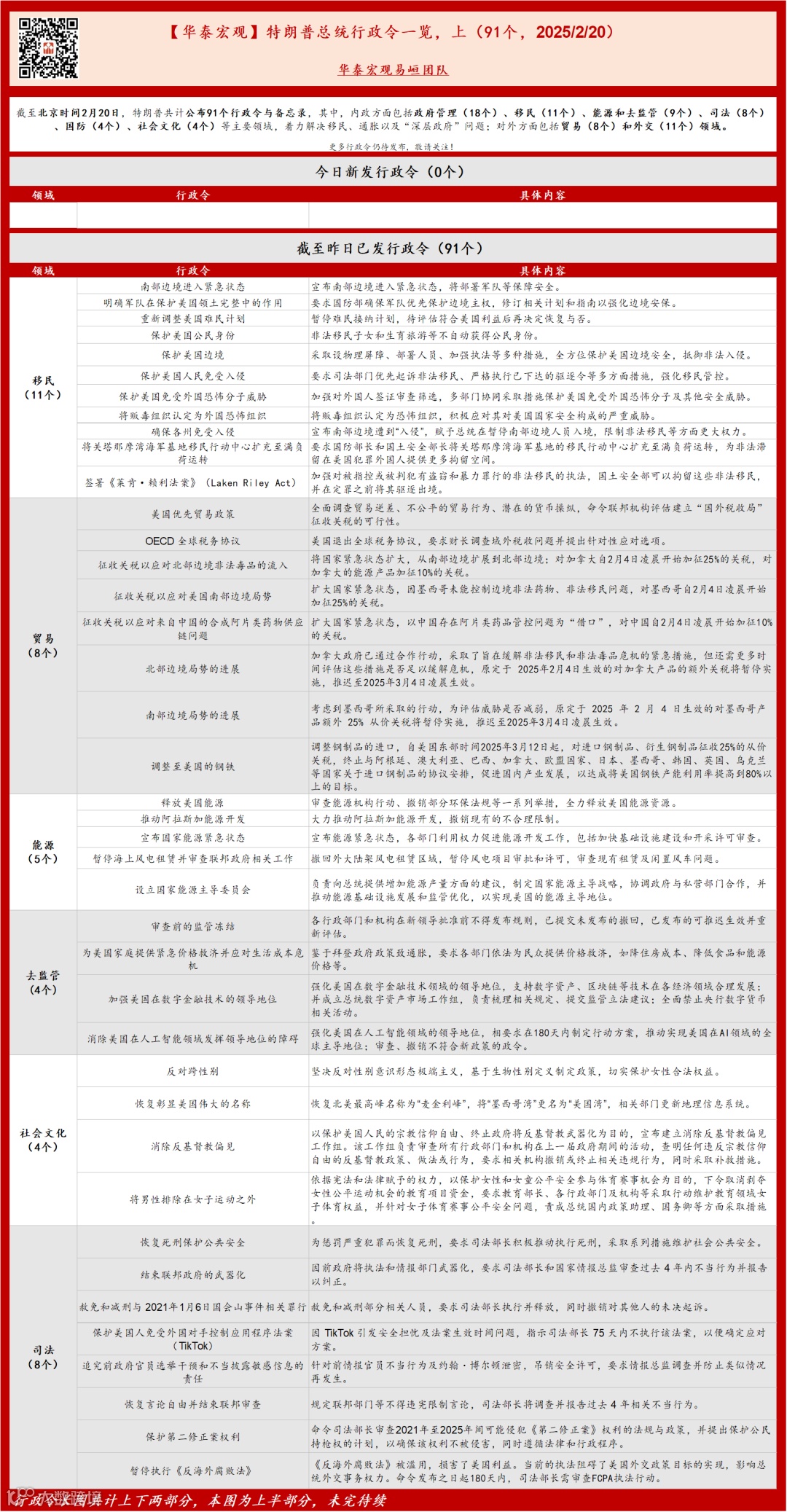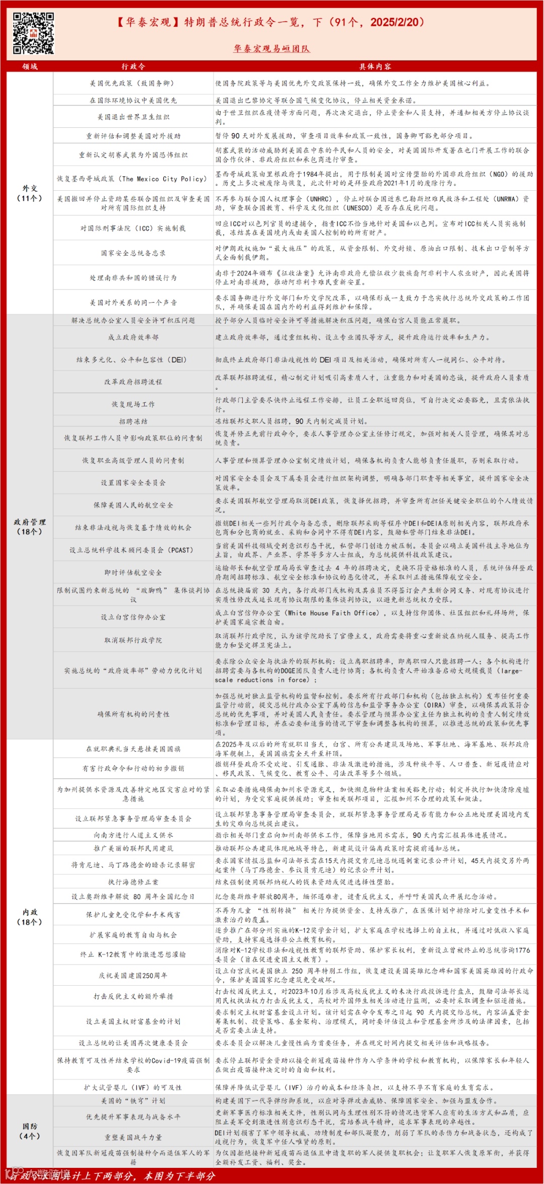 截至北京时间2月20日,特朗普共计公布91个行政令与备忘录,整体涉及内政及对外两方面。其中,内政方面包括政府管理(18个)、移民(11个)、能源和去监管(9个)、司法(8个)、国防(4个)、社会文化(4个)等主要领域,着力解决移民、通胀以及“深层政府”问题;对外方面包括贸易(8个)和外交(11个)领域。