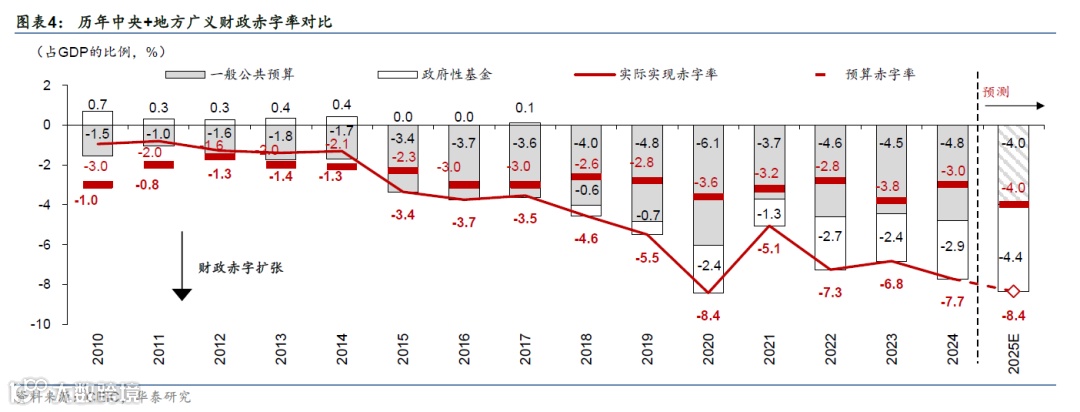 中央层面的表观赤字率和赤字规模高于去年——2025年安排一般公共预算赤字规模5.66万亿元,对应狭义赤字率4%,均为历史新高;新增地方专项债额度亦较去年两会目标的3.9万亿元上升至4.4万亿元、叠加1.8万亿的超长期特别国债。由此,今年广义(中央+地方)财政新增总融资规模达到13.9万亿元,较2024年的目标值11万亿元同比多增2.9万亿元,可用于财政支出的净融资规模(包括2024年结转资金)合计11.8万亿元,较24年实际实现水平同比多增2.1万亿元(图表2-3);合计预算财政赤字率从去年两会时制定的6.6%回升至8.4%,对比去年实际实现的广义财政(一般公共预算+政府性基金)赤字率7.7%呈现温和扩张(图表4)。