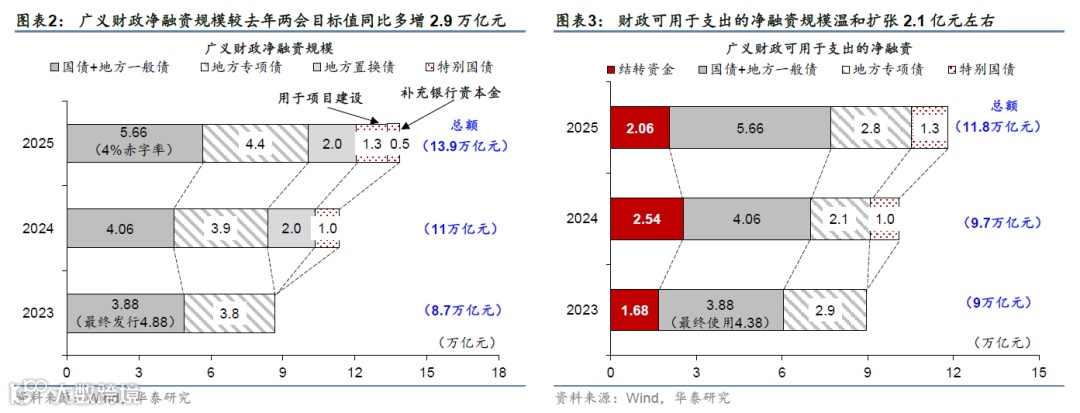 表观赤字率和赤字规模高于去年——2025年安排一般公共预算赤字规模5.66万亿元,对应狭义赤字率4%,均为历史新高;新增地方专项债额度亦较去年的目标值3.9万亿元上升至4.4万亿元、叠加1.8万亿的超长期特别国债。由此,今年广义(中央+地方)财政新增总融资规模达到13.9万亿元,较去年目标值同比多增2.9万亿元,可用于财政支出的净融资规模(包括2024年结转资金)合计11.8万亿元,较24年实际实现值多增2.1万亿元;合计预算财政赤字率从去年两会时制定的6.6%回升至8.4%。