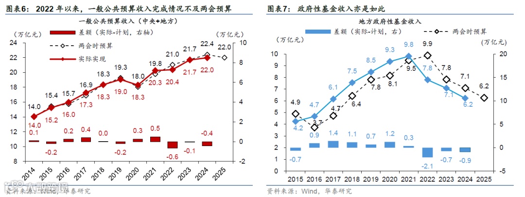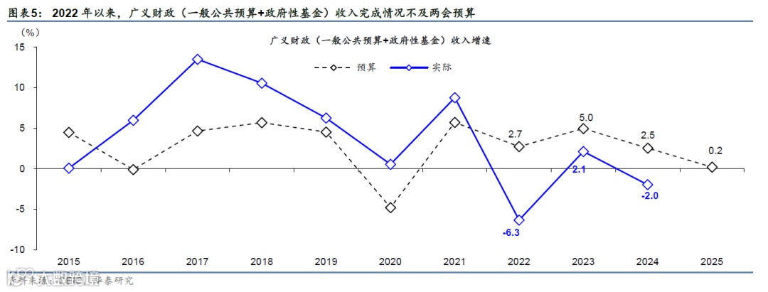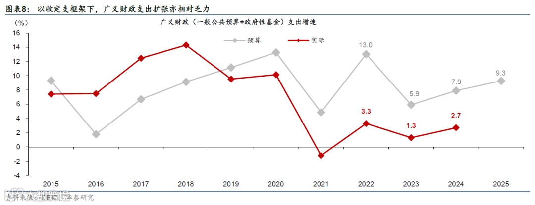 同时,考虑到当收入回落时、赤字扩张或有一定“被动”的成分,因此财政主动扩张还应参考广义财政支出增速,而非仅关注赤字额。根据预算草案,今年广义财政支出同比增速目标为9.3%,其中,一般公共预算/政府性基金预算支出同比增速目标分别录得4.4%/23.1%,而政府性基金收支增速或与地产市场走势密切相关。2022年以来地产周期持续调整,地方政府土地出让收入承压,由此2022-2024年政府性基金收入实际实现额不及两会时公布预算(图表7);以收定支原则下地方政府性基金支出扩张亦相对乏力、地方政府财政收入缺口较大,此时的赤字扩张或有一定“被动”的成分,由此,我们认为(中央+地方)广义财政实际支出增速可能是更好的评估指标。两会预算隐含的广义财政支出增速目标呈现温和扩张——2025年财政预算草案中,广义(一般公共预算+政府性基金)支出同比增速9.3%、快于赤字率隐含的4.9%的名义GDP增长,其中一般公共预算/政府性基金预算支出同比增速分别录得4.4%/23.1%。具体而言: