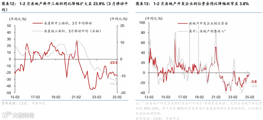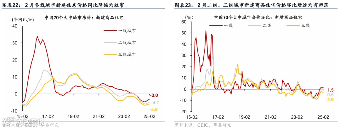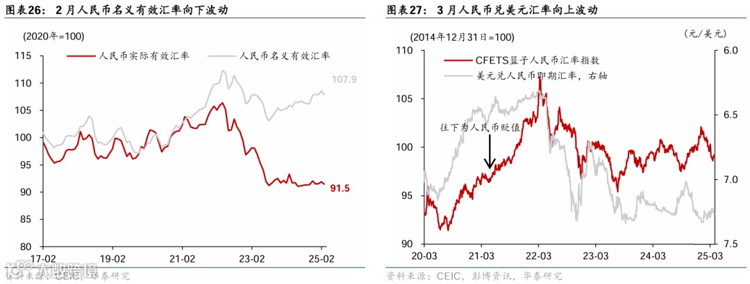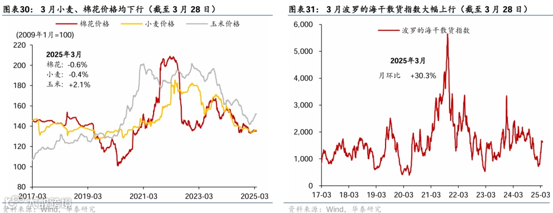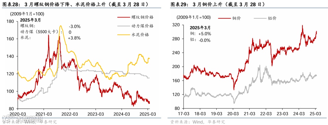 通胀:国际油价回落、金价持续走高,农产品价格季节性回落。截至3月28日,布伦特油价环比回落4.9%至73.6美元/桶;COMEX黄金月环比震荡上行2.5%至3,118美元/盎司,创历史新高。国内原材料呈现分化——铜/水泥价格环比回升5%/3.8%,螺纹钢价格环比回落3%。农产品价格总体回落,其中猪肉/蔬菜价格环比回落5.0%/5.5%。