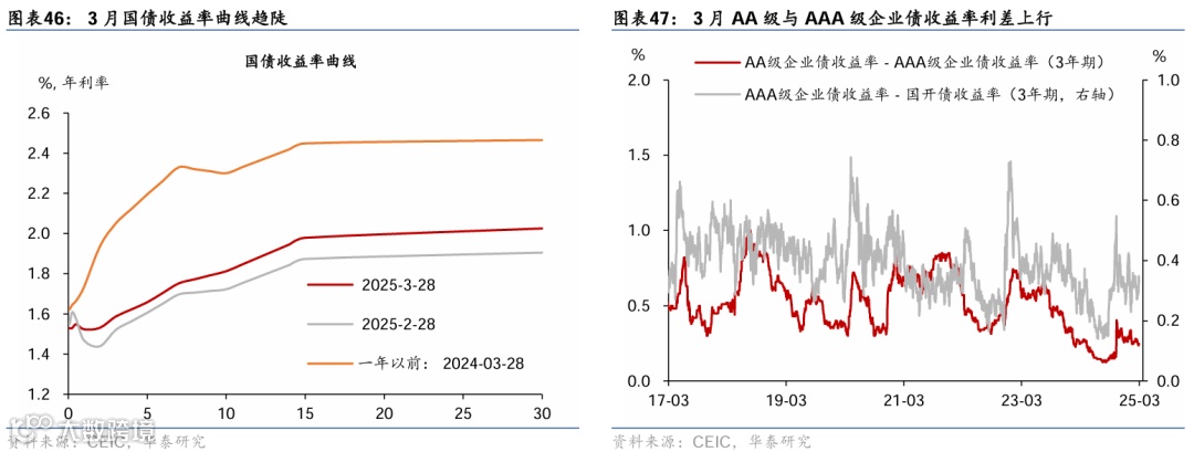 金融市场:3月LPR连续5个月持平;利率债净发行同比多增。国债收益率曲线趋陡:截至3月28日,1/10年期国债收益率月环比上行7.4/8.8bp;银行间流动性偏松,R007/DR007月环比回落4/19bp。3月国债、地方债和政策性银行债合计净发行1.49万亿元,同比多增9,570亿元。汇率方面,截至3月28日,人民币兑美元汇率上升0.3%、兑一篮子货币亦回撤0.9%。
