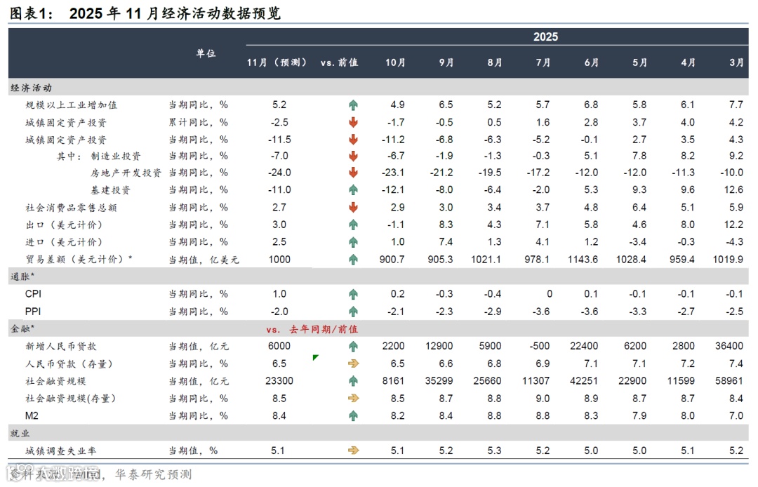 工业:我们预计11月规模以上工业增加值同比增速从10月的4.9%略回升至5.2%左右。随着假期错位等扰动因素消退,工业生产环比呈现边际改善,11月制造业PMI较10月的49.0%边际回升至49.2%,但同比指标回升动能亦偏弱。高频数据显示,11月焦化/高炉开工率同比较10月的0.7/2.8个百分点放缓至-1.8/0.2个百分点,显示整体生产回升动能相对偏弱。