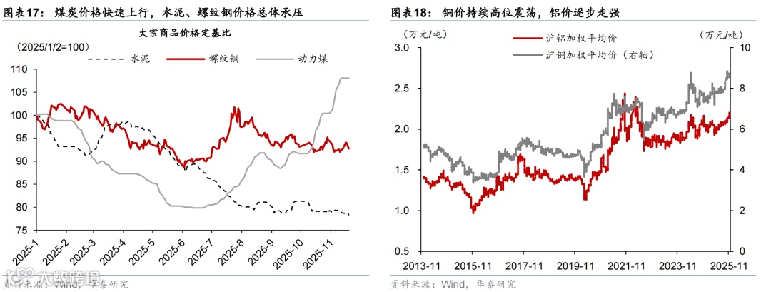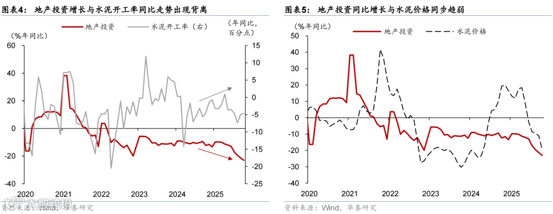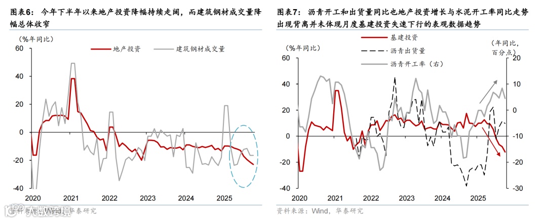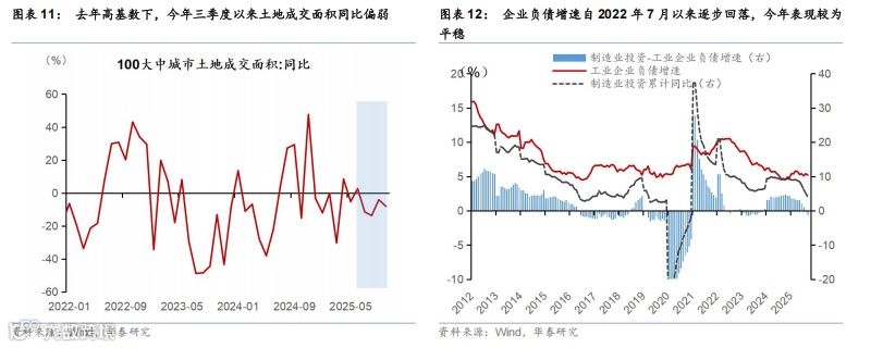 固定资产投资完成额等指标的统计口径等变化因素。虽然近期建筑和开工相关指标走势较平淡,但并未体现月度固定资产投资大幅下滑的表观数据趋势。不排除月报固定资产投资或部分受统计口径差异及项目填报周期影响,读数放大实际波动。①固定资产投资完成额统计口径包括土地购置费,下半年土地成交面积同比回落或形成拖累;② “反内卷”政策推进对地方政府补贴行为形成约束,或拉长基建、制造业投资等申报周期,亦可能影响投资额确认节奏,从而拖累当期投资读数。