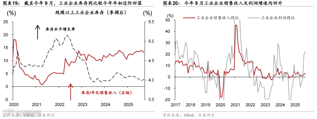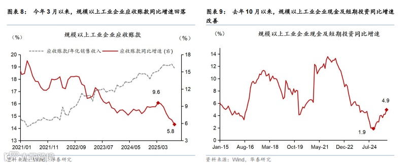 工业企业数据层面,今年9月规模以上工业企业盈利/营收同比较8月的20.4%/2.3%进一步回升至21.6%/3.1%(图表20)。尤其是工业企业现金及短期投资同比较7月的4.2%小幅上行至8月的4.9%,应收账款同比增速亦持续回落,可能显示出强出口及“反内卷”政策推动企业现金流改善(参见《强出口+反内卷推动企业现金流改善》,2025/10/27)。